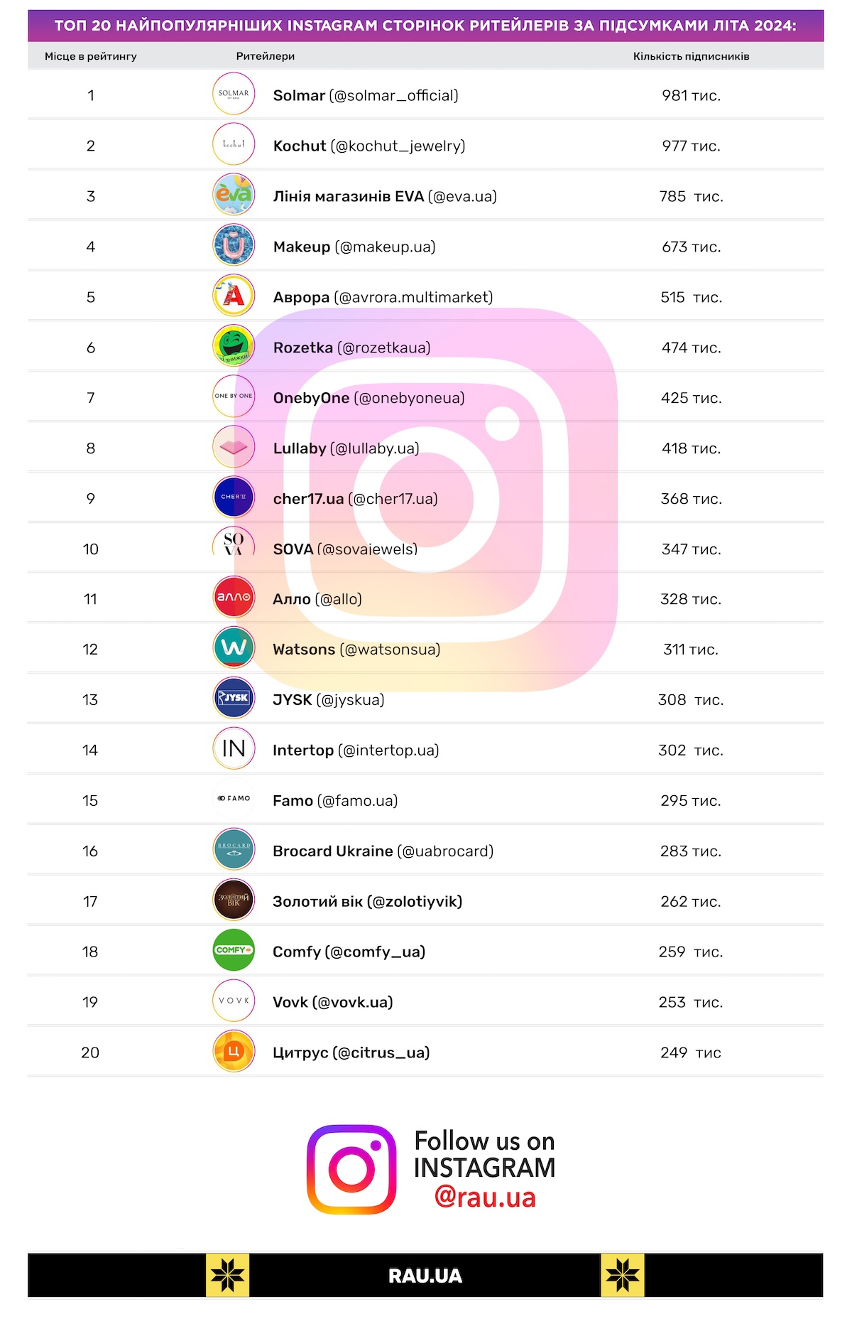Також за літо мережа OnebyOne випередила молодого beauty-ритейлера Lullaby, мережа Сomfy знову опустилась на 18 сходинку, бренд Vovk також повернувся на 19-ту сходинку, а Цитрус цього разу закриває рейтинг ритейлерів в Instagram.