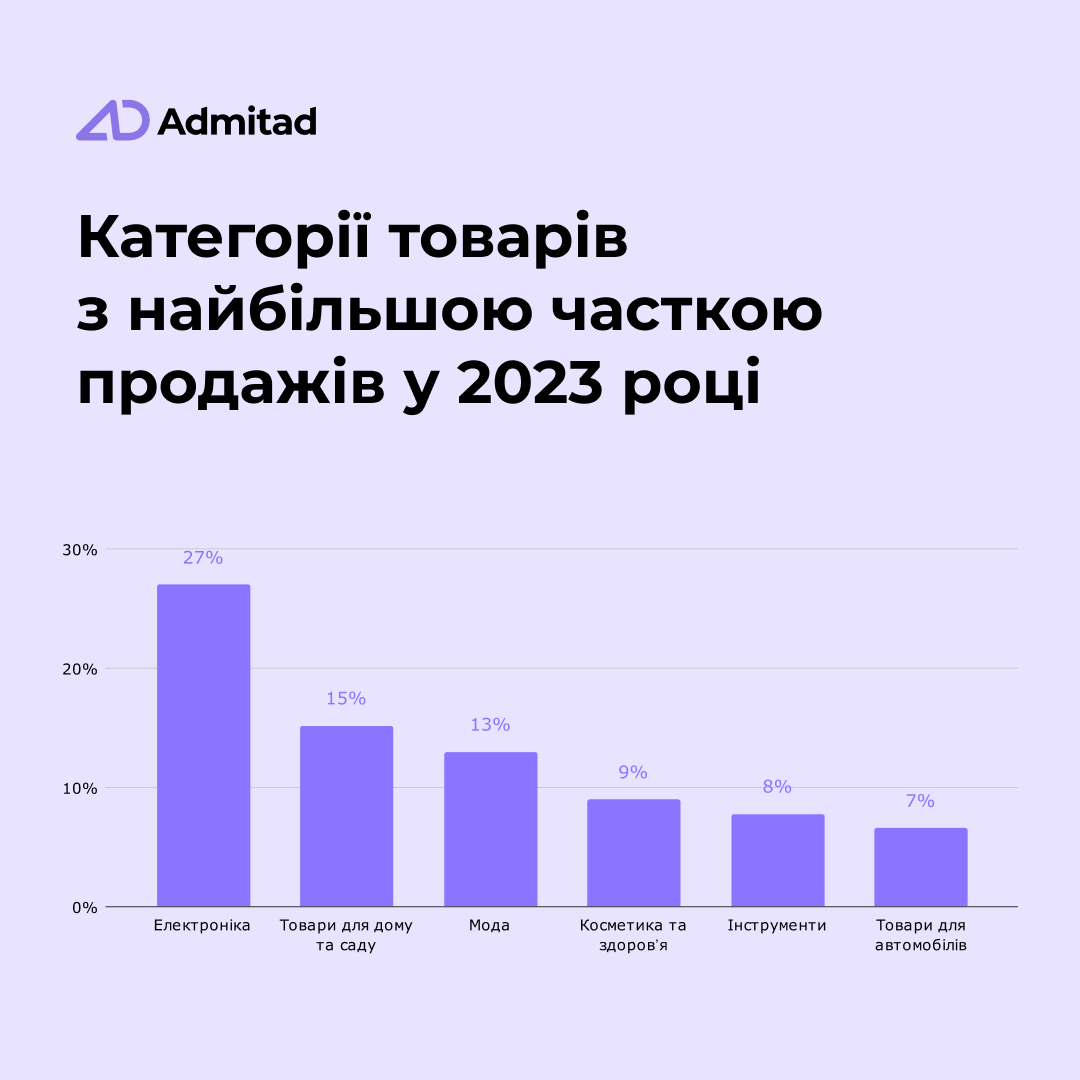 Основні категорії товарів, які, за підрахунками Admitad, залучили найбільшу частку продажів у 2023 році, включають: електроніку (27%), товари для дому та саду (15,2%), моду (13%), косметику та здоров’я (9%), інструменти (7,8%) і товари для автомобілів (6,6%).