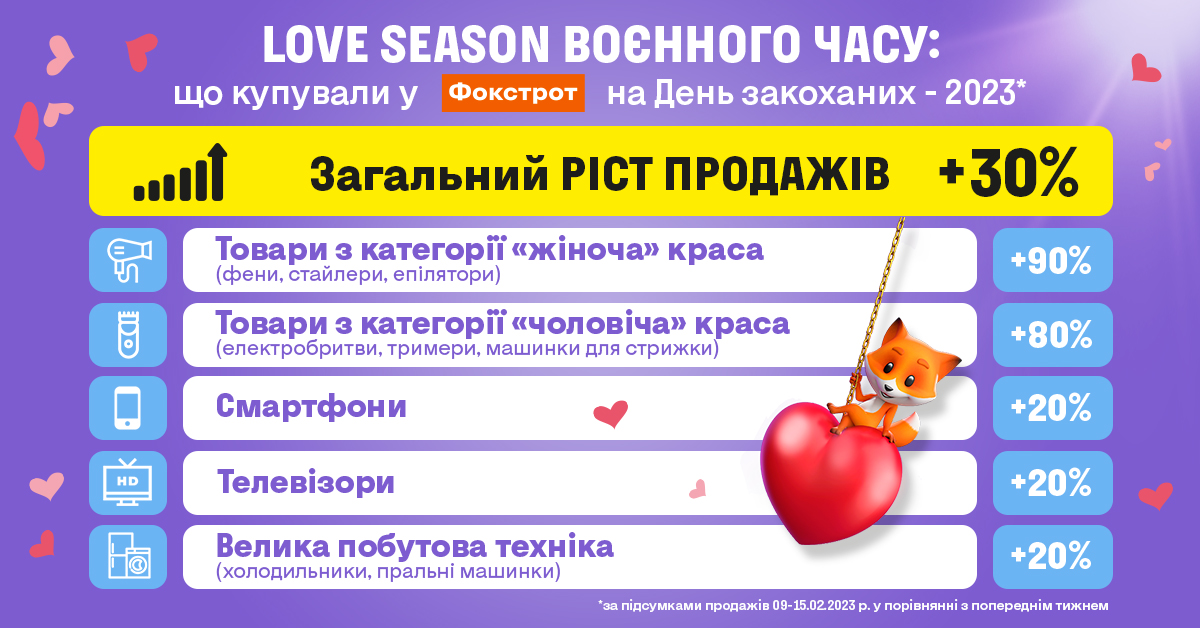 Цьогоріч День всіх закоханих відзначився своїми особливостями, та попри стримані прогнози 14 лютого відбулося, і навіть перевершило очікування. Це підтверджує позитивна динаміка продажів у Фокстрот у цей період.