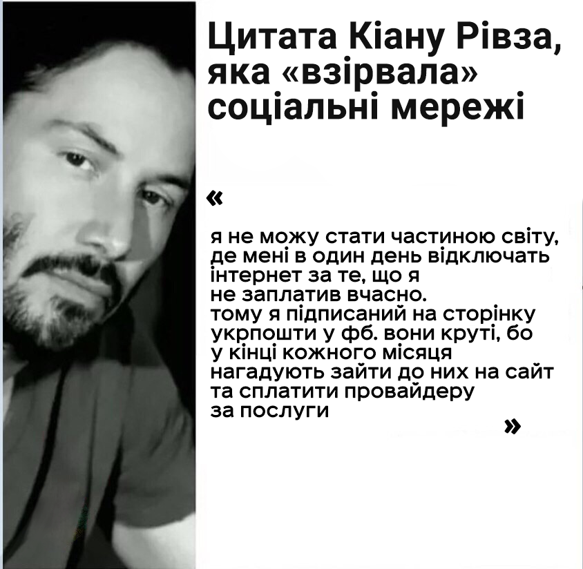 Укрпошта згадали старий жарт про те, що не варто вірити цитат у соцмережах. За приклад взяли придуману цитату Кіану Рівза, підписавши: “ми не любимо хизуватися, але з пісні слів не викинеш”.