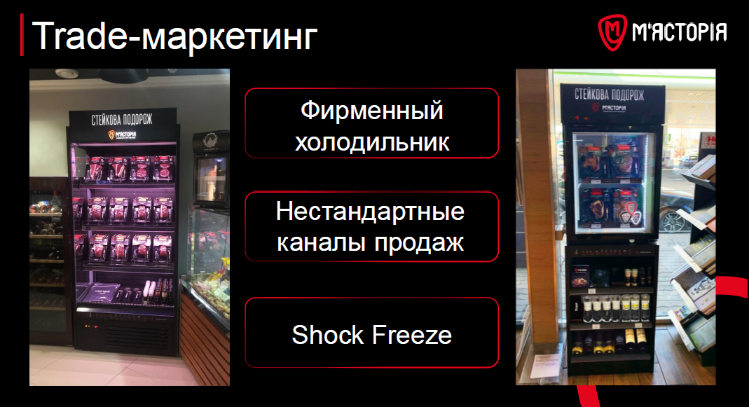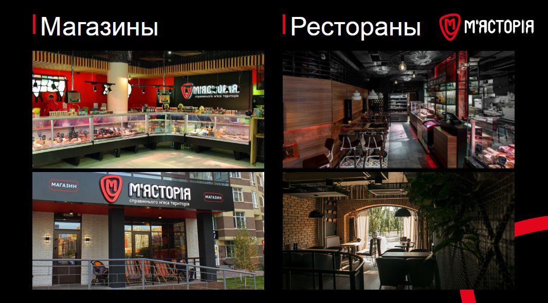 Аналогічно намагався працювати через формат магазину-ресторану засновник М’ясторія Андрій Усенко. Однак спроба поєднати ресторан і магазин на маленькій площі, крім ефекту синергії дала і зворотний ефект: не всі люди хочуть купувати в ресторані або їсти в магазині. Тому згодом концепцію змінили, запропонувавши клієнтам проект «стейкових подорож», коли в брендованих холодильниках компанії в мережах МегаМаркет і заправках ОККО з’явилися набори для швидкого приготування вдома стейка ресторанного якості. Потім пішли у винні магазини, делікатес-маркети, невеликі магазини біля дому, наприклад – ОКwine, HolovaNoga, SelectO, Еко-лавка й інші, а також в класичний ритейл (Novus, Metro).