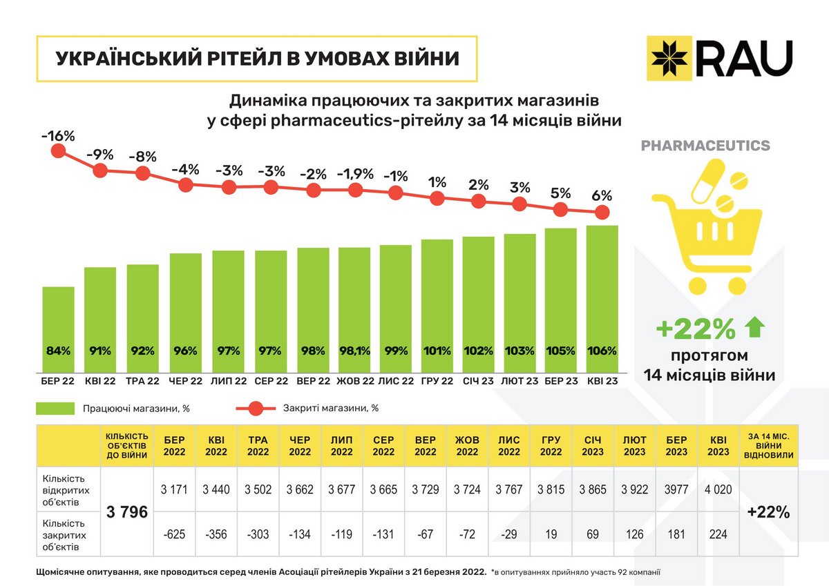 Надалі частка позитивного приросту кількості аптек та аптечних пунктів лише посилювалася, і в квітні 2023 року вже працювало більше 4000 точок. Це перевищило їх кількість до війни на 6% або на 224 торгові об’єкти. Таким чином, з березня 2022 року до квітня 2023-го кількість працюючих аптечних закладів збільшилася на 22%, компенсувавши падіння на 16% та забезпечивши зростання на 6%.