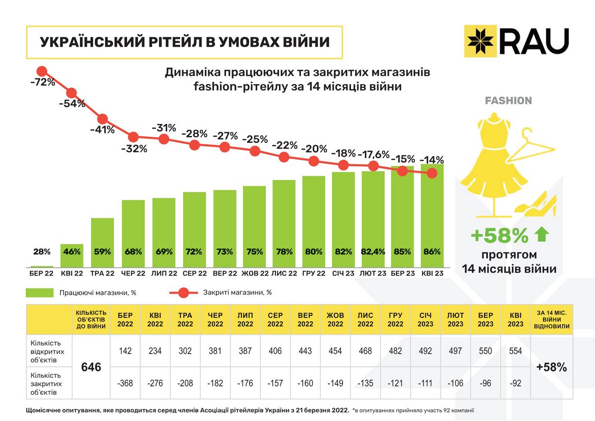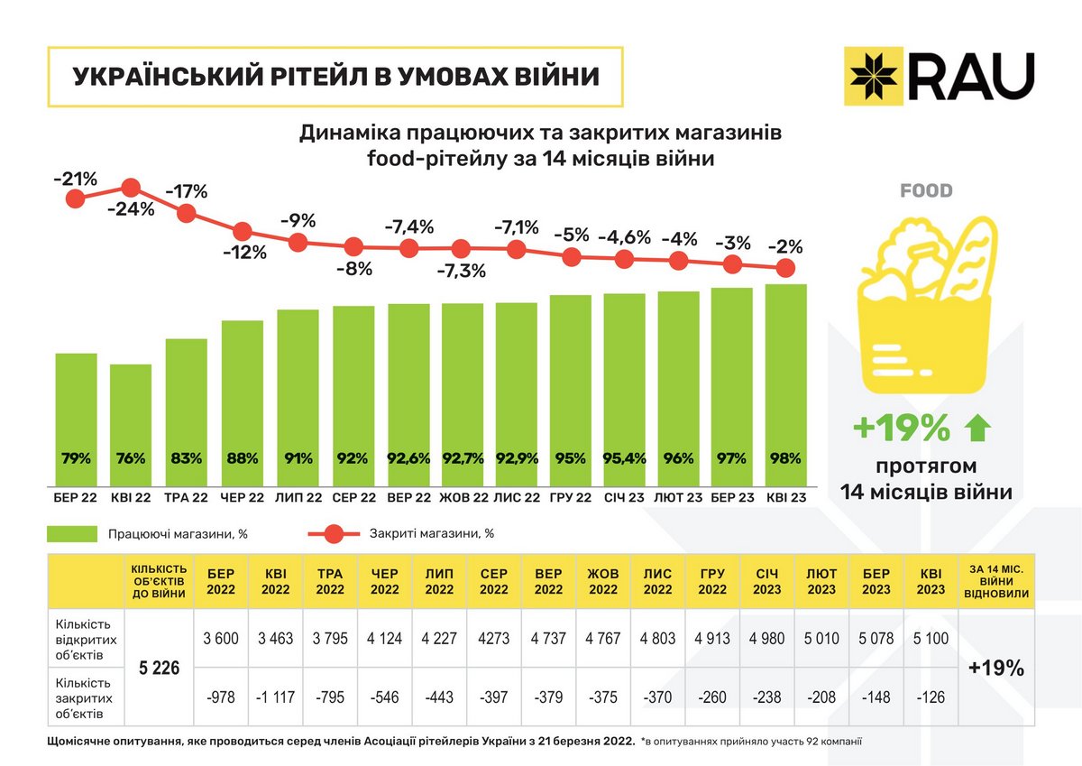 Як показало щомісячне дослідження, яке регулярно проводиться серед членів Асоціації рітейлерів України з 21 березня 2022 року методом онлайн-опитування приблизно сотні власників та CEO підприємств по всій Україні, наразі закритими лишається тільки 3% торгових об’єктів/магазинів. За 14 місяців війни цей показник зменшився на 26%.