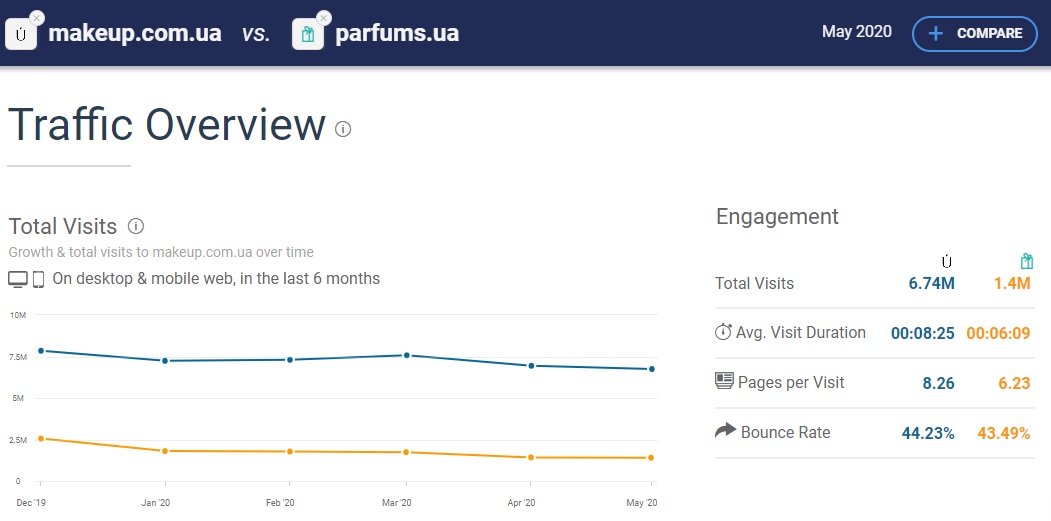 На перший погляд, лідерство Makeup на українському ринку очевидно. Однак, якщо проаналізувати динаміку відвідуваності інтернет-магазину, ситуація компанії буде не такою вже й радісною. За даними того ж Similar Web, за перші 5 місяців 2020 року відвідуваність українського Makeup зросла лише на 0,9% (35,8 млн сеансів проти 35,5 млн в січні-травні 2019-го). І це при тому, що в поточному році епідемія коронавірусу та карантинні обмеження істотно прискорили зростання онлайн-торгівлі.