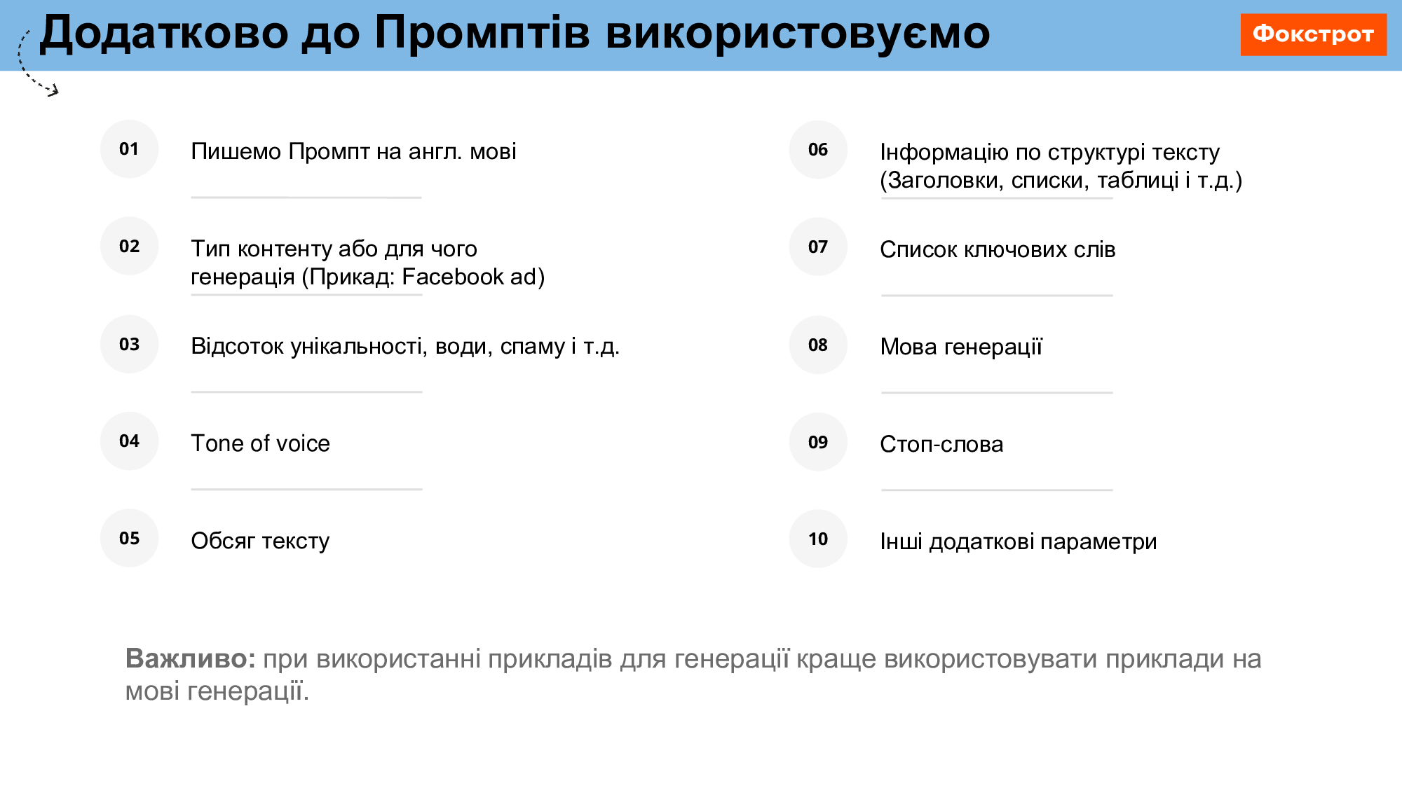 - ТЗ краще писати англійською мовою, проте ШІ можна попросити видати результати певною мовою, скажімо, українською.