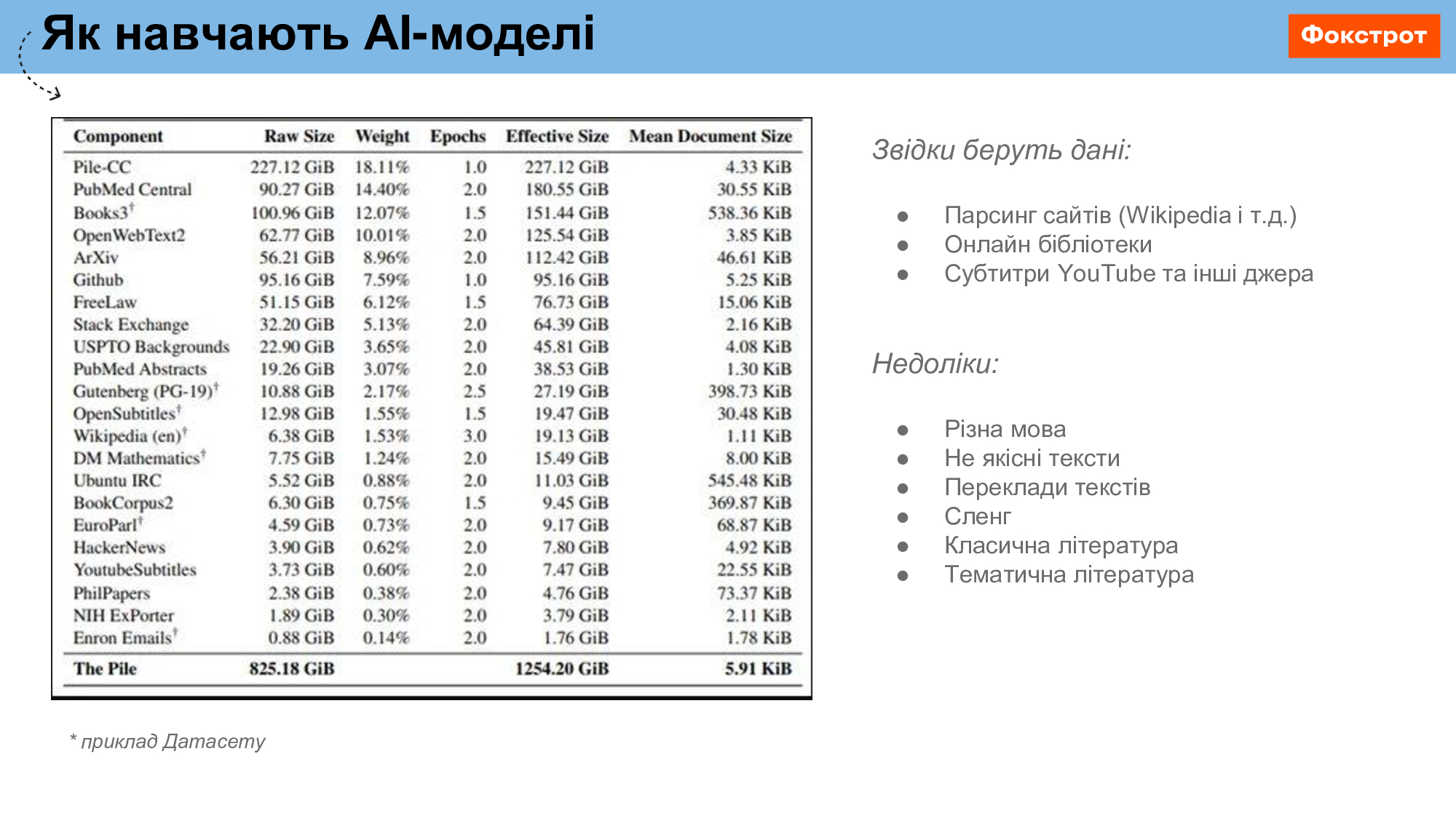 Важливо розуміти, що GPT – це модель, яку навчили на великій кільки різноманітної інформації зі всього світу, як-то: онлайн бібліотеки парсинг сайтів, субтитри в YouTube тощо. Про це каже і літера P у назві, яка означає, що модель Pre-trained (попередньої навчена). Що є, як плюсом, так і мінусом, бо зібрані дані, умовно, з різних епох, могли бути неякісні тексти, сленг, неточні переклади, велика різниця між тематичною та класичною літературою і т. д.