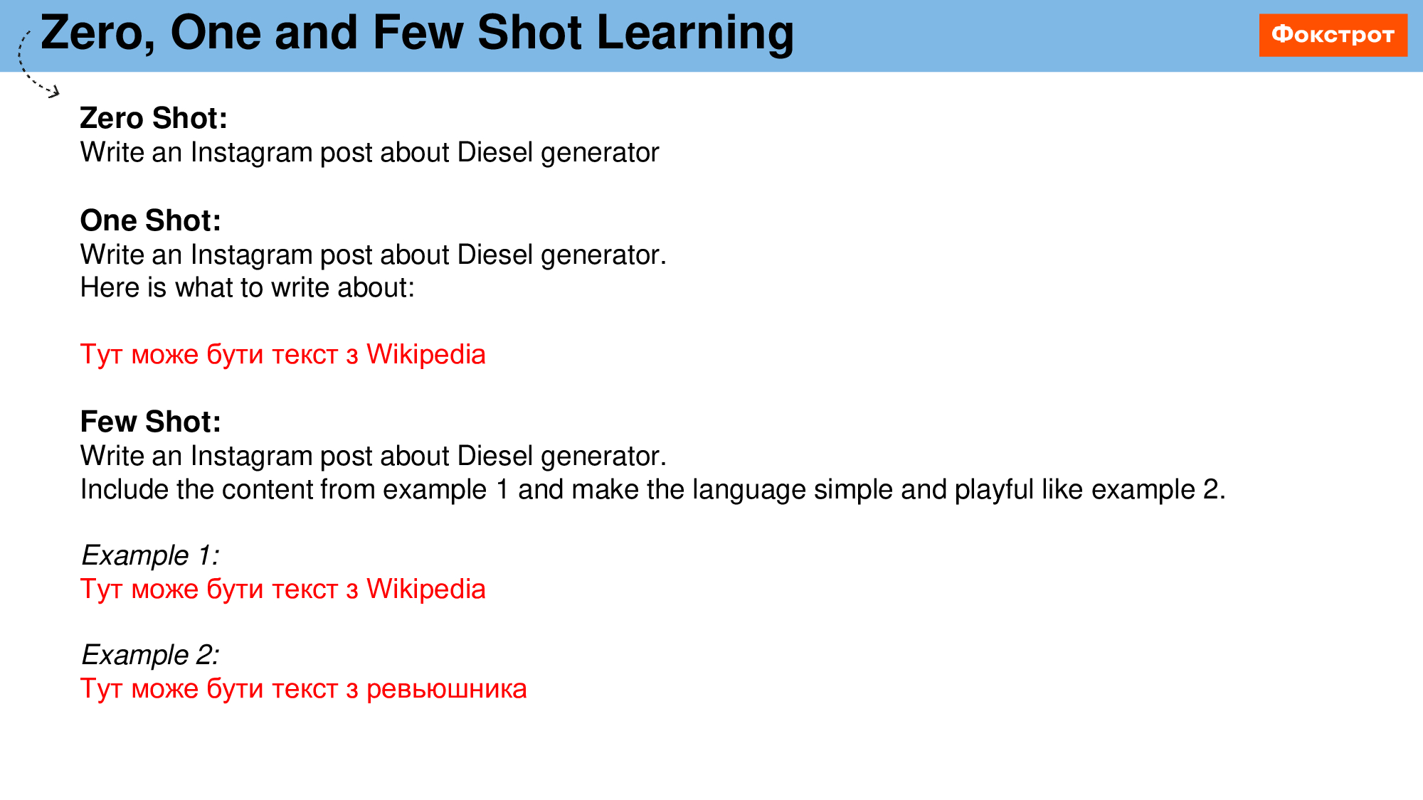 One Shot – генерація тексту, коли штучному інтелекту даємо певний приклад. Тобто це дані, на основі яких він напише текст. Після генерації ви його читаєте, а він здається «сирим». Далі можна вдосконалити його технікою Few Shot. Тобто дати ШІ додаткові параметри: беремо перший текст з даними та пишемо, що це має бути текст для допису в для соціальній мереж. ШІ зважаючи на таке ТЗ видасть більш «живий» текст.