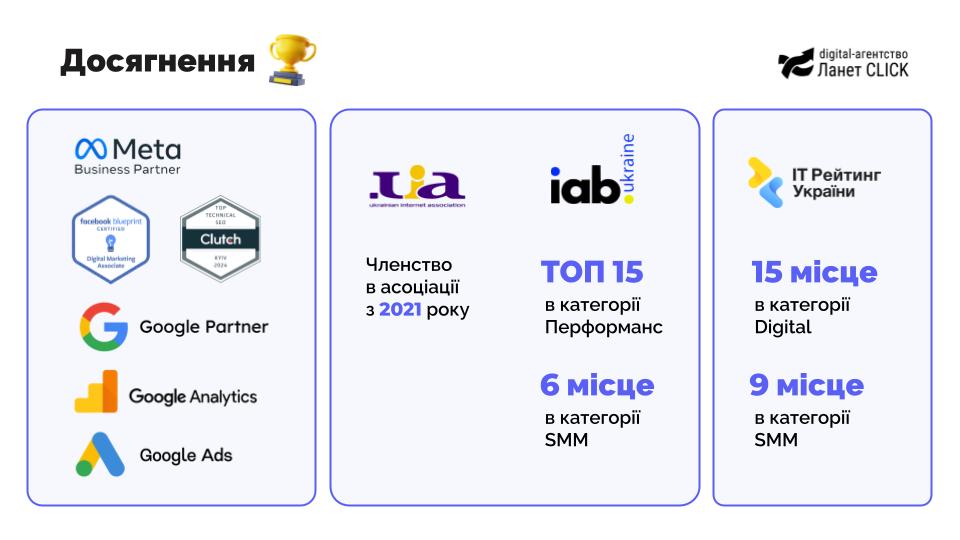 Компанія є партнером Google та Meta та відслідковує всі останні тренди на ринку, в тому числі беручи участь у багатьох профільних асоціаціях та конференціях. Реалізовані кейси дозволили отримати високі позиції в iab Ukraine та в IT Рейтингу України.