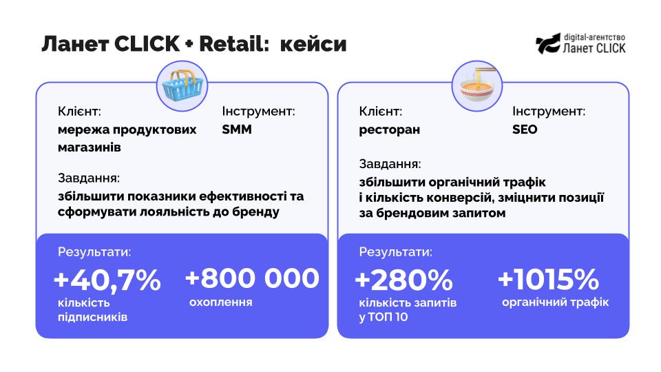 У сфері ритейлу фахівцям агенції довелося стикнутися з дуже різними завданнями. Так, ритейлери хоч і зосереджені на роботі фізичних торгових точок, але вони активно шукають можливості ефективно застосовувати онлайн-інструментарій для розширення своєї аудиторії. Інколи як самостійний канал продажів (інтернет-магазин), а інколи – для посилення відвідуваності звичайних магазинів. Відповідно різняться й методи реалізації.