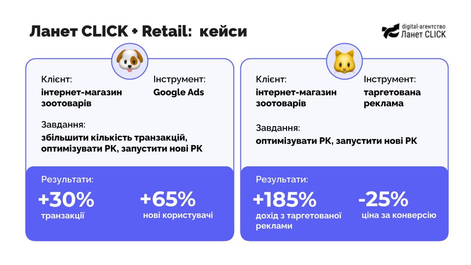 Цікавим є приклад покращення роботи інтернет-магазину зоотоварів, який ритейлер використовує як окремий канал продажу. Оскільки головна ціль – збільшення продажів, то й основним інструментом став Google Ads, а також все, що супроводжує розвиток проєкту в пошуку клієнта. Наприклад, таргетована реклама у Facebook та Instagram. В Google Ads переважно робота велася над товарною рекламою в поєднанні з оптимізацією рекламних кампаній. В результаті при незмінному бюджеті вдалося збільшити кількість транзакцій. Що переконало клієнта наростити бюджети для масштабування реклами. Проте орієнтація на преміальний сегмент дещо обмежувала аудиторію. Тому клієнт потребував окрім прямих конверсійних форматів додатково пошуку підходів до розширення аудиторії. Аби досягти цього довелося розробляти спеціальну медійну кампанію, що дозволило більш ніж удвічі розширити цільову аудиторію. До якої потім «достукувалися» за допомогою транзакційних форматів.