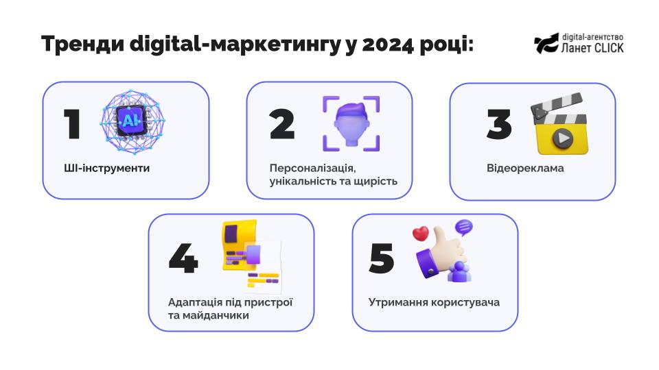 Серед основних трендів digital-маркетингу в 2024 році варто відзначити п’ять основних. Окрім різноманітних інструментів використання штучного інтелекту все більше значення набуває персоналізація та унікальність, грубо кажучи «людське обличчя» та щирість, яку відчуває клієнт. Не можна не відмітити більш активне використання відеоформатів, в тому числі в прямій рекламі. Так само важлива адаптація під різноманітні пристрої та формати й місця розміщення реклами. Більше не можна зробити один банер і запустити його скрізь – ефекту не буде. Потрібна оптимізація під кожен рекламний майданчик. Найбільша ж цінність знаходиться в царині утримання користувача, ущільненні контакту з аудиторією, бо більш важливо втримати тих, кого вдалося знайти завдяки вище переліченим технікам.