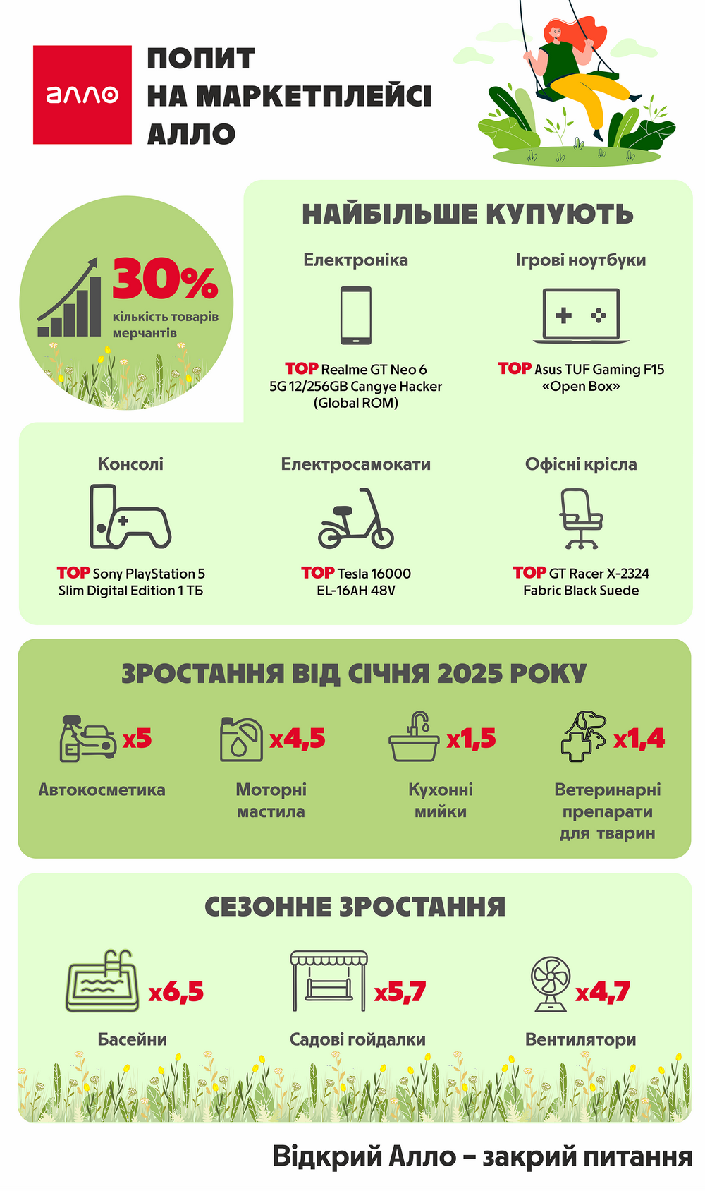 На маркетплейсі Алло від початку 2025 року кількість товарів мерчантів зросла на 30% проти аналогічного періоду минулого року. Зокрема, лише у липні було створено майже 1 млн нових карток товарів. Також зростає попит і на товари мерчантів.