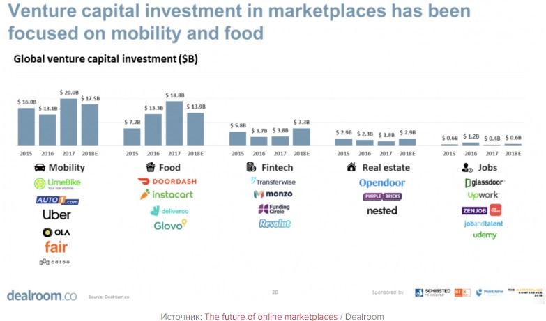 За даними дослідження The Future of Online Marketplaces, проведеного Dealroom, найбільші обсяги інвестицій останнім часом отримують транспортні послуги та food-маркетплейси. Це багато в чому пояснюється, з одного боку, сильними потребами в капіталі, а з іншого – великою часткою цих областей в споживчих витратах. Серед інших популярних – fintech-напрямок, нерухомість і сервіси для пошуку роботи і відгуків про компанії.