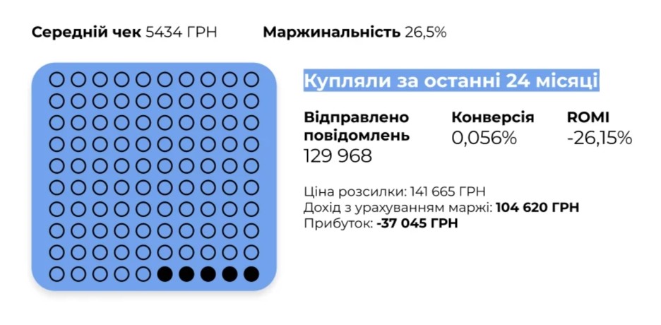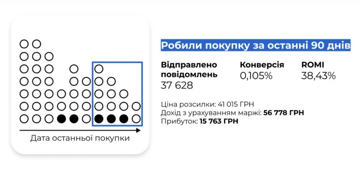 Як бачимо, це призвело до збитків. Зробивши висновки, маркетолог висуває гіпотезу, що з більшою ймовірністю до купівлі вдасться залучити клієнтів, активних протягом 90 днів. Результати вже кращі: