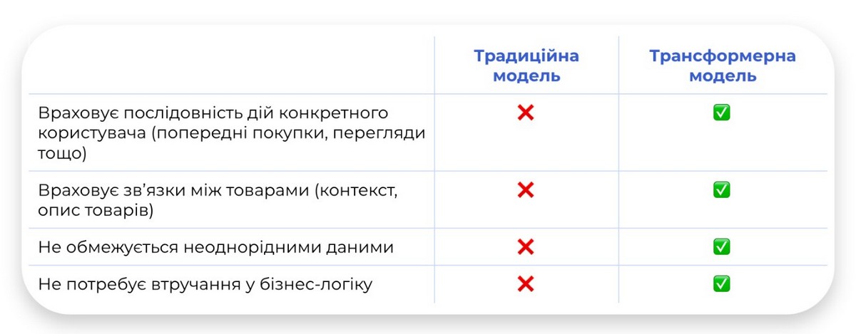 - Висока точність — безумовна перевага трансформеної моделі у порівнянні з традиційними підходами. Завдяки їй підвищуються конверсії та середній чек.