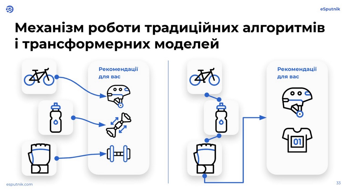 Якщо покупець замовив на сайті футболку, кросівки і велосипед, традиційні моделі ймовірно пропонуватимуть альтернативи цих товарів: ті ж бренди, але інші кольори, або схожі товари інших брендів. Натомість трансформерна модель зрозуміє, що клієнт захоплюється велоспортом, і запропонує шолом чи екіпірування для велоспорту.