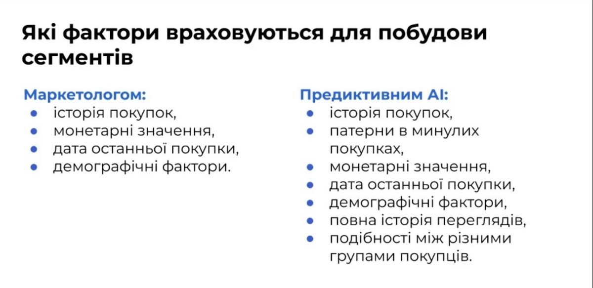Ручна сегментація на стратегічному рівні дозволяє сформувати сегменти, з якими бізнесу варто працювати в першу чергу — тут експертиза маркетолога однозначно перевищує технічні можливості АІ. Проте на тактичному рівні її використання стає менш ефективним. Це стосується всіх каналів, але особливо це відчутно при роботі з відносно дорожчими з них (Viber та SMS), адже може принести збитки.