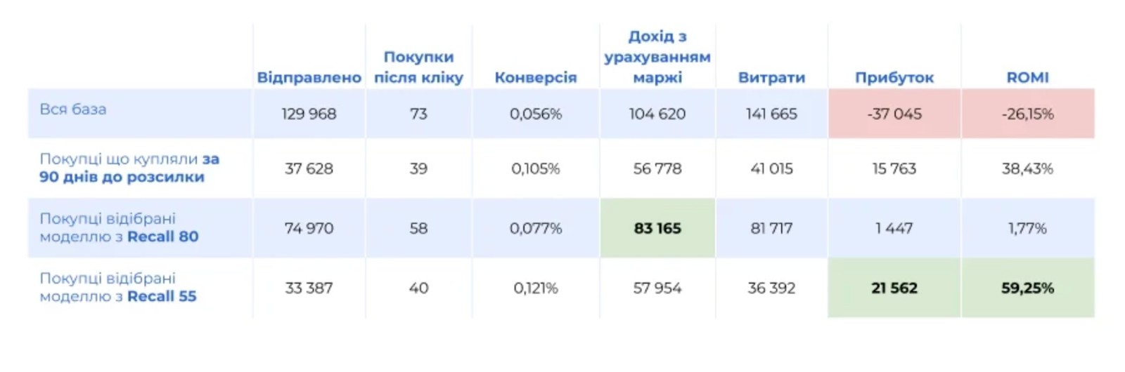 Перші два сегменти оптимальні для збільшення конверсій та продажів, а останні два можуть використовуватися або для виключення з кампаній, або для реактиваційних пропозицій. Усвідомивши можливості врахування чутливості, маркетолог проводить ще дві розсилки (з різними показниками recall). Дані своїх експериментів він заносить у порівняльну таблицю і бачить результати, що підтверджують ефективність предиктивної моделі: