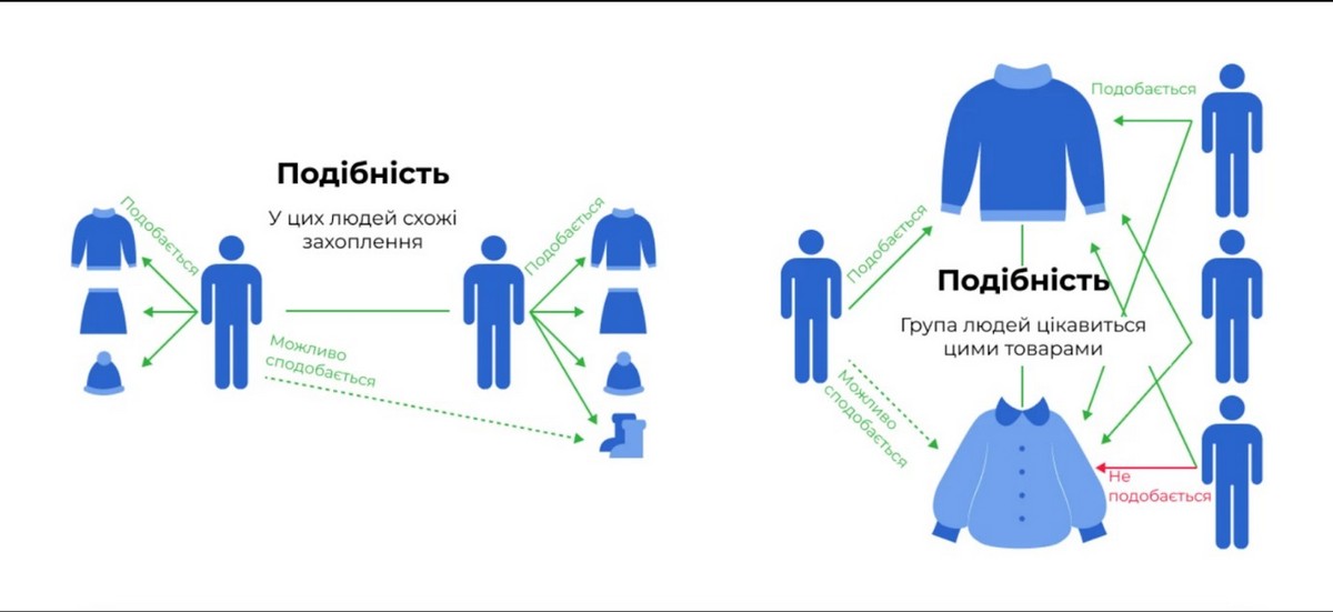 - на основі вподобань клієнтів, коли АІ знаходить покупців, схожих на конкретних клієнтів, і пропонує товари, яким віддають перевагу схожі користувачі;