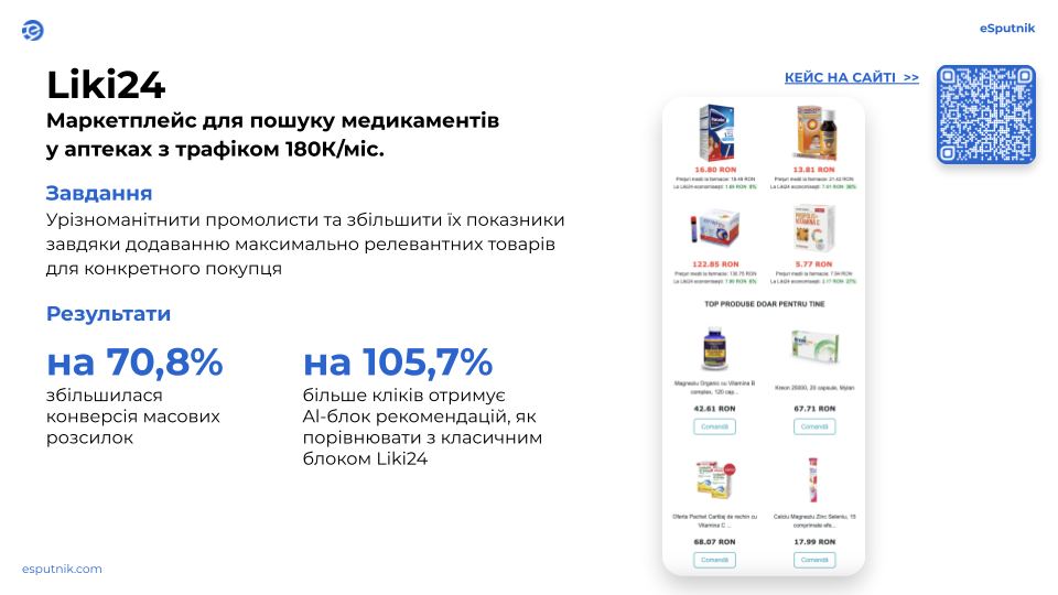 Ось реальний кейс ритейлера, який досяг зростання ключових показників завдяки впровадженню товарних рекомендацій на базі АІ. Для Liki24 товарні рекомендації принесли збільшення конверсії масових розсилок та переходів на сайт.