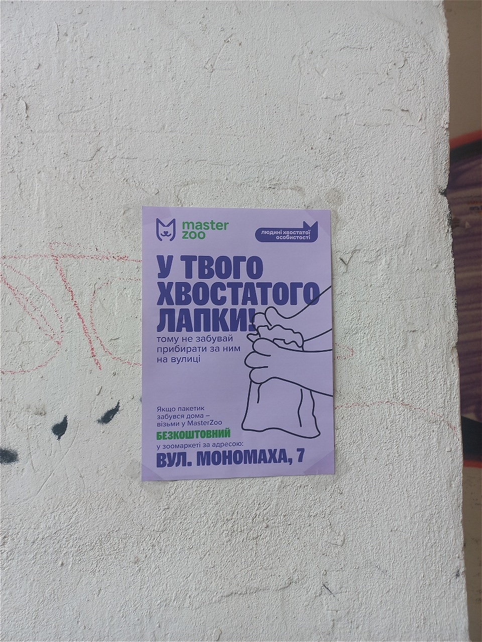 Всеукраїнська мережа зоомаркетів MasterZoo запустила ініціативу “У мене лапки!“. Ритейлер розробив спеціальні інформаційні таблички та плакати, які закликають прибирати за песиками під час прогулянок на вулиці, а у випадку, якщо з собою немає пакетика — його безоплатно можна отримати в найближчому MasterZoo.