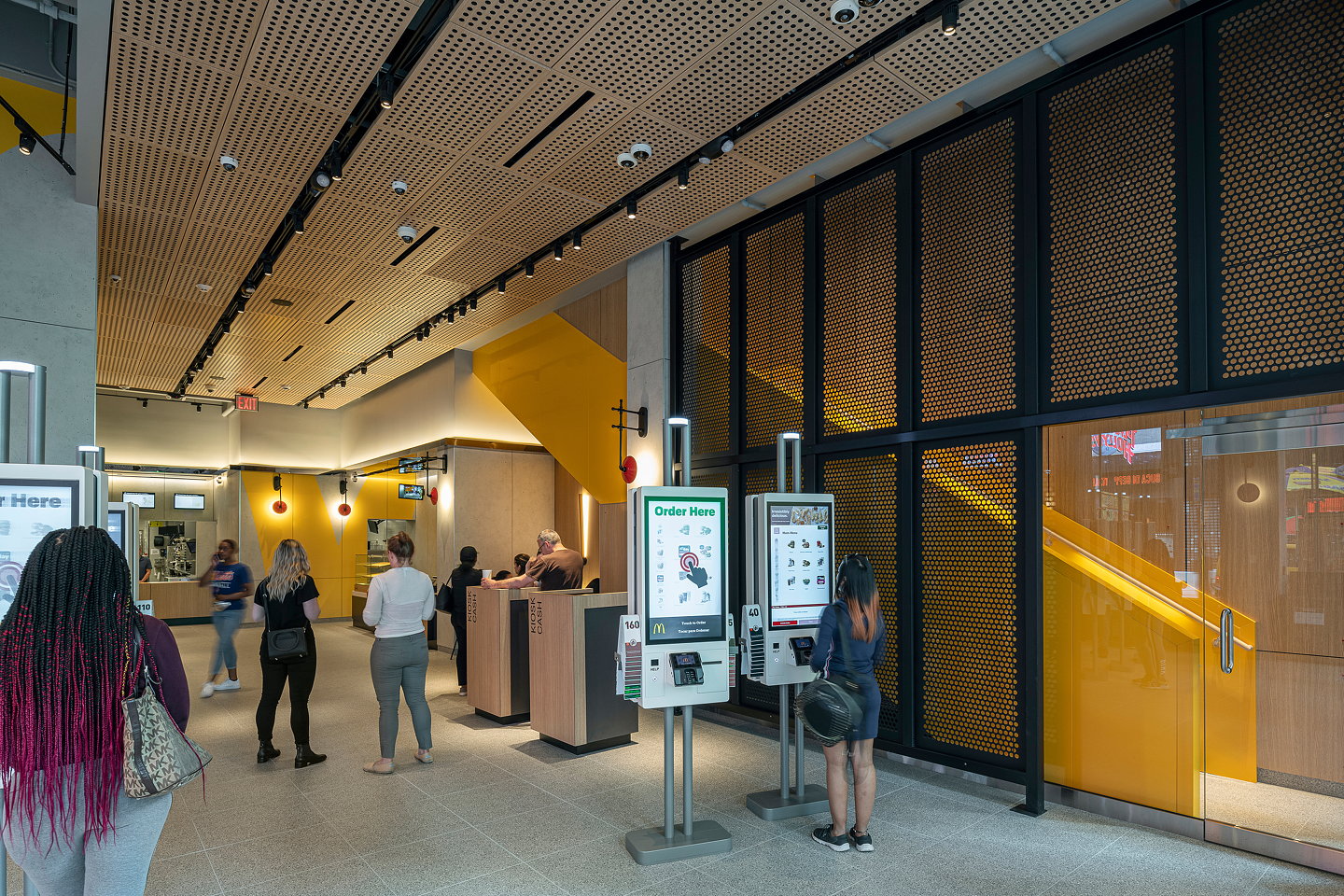 Оформляти й оплачувати замовлення клієнти можуть відразу при вході за допомогою інтерактивних моніторів. Традиційні пункти обслуговування та зони отримання замовлень на винос знаходяться поруч з ними, також можна замовити обслуговування за столиком.