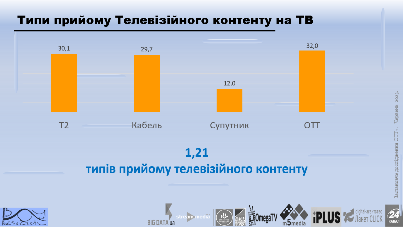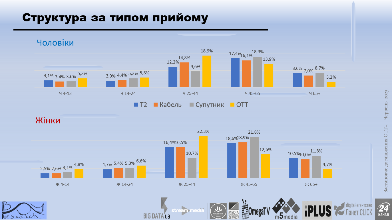 Інформація щодо демографічних показників перегляду контенту серед українців демонструє переважання типу прийому ОТТ у трьох вікових категоріях. Така статистика передбачає, що у майбутньому відсоток глядачів інтернет-телебачення тільки зростатиме.