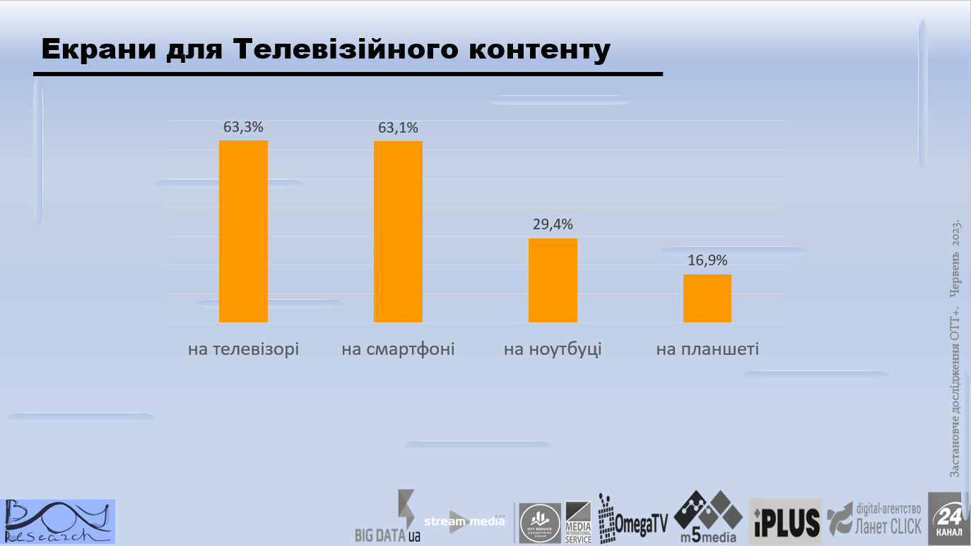 Більшість користувачів цифрових та інтернет-платформ переглядають контент на телевізорі (63,3%). Майже з такою ж частотою українці обирають для перегляду смартфони (63,1%). На третьому місці — ноутбуки (29,4%), а на останньому — планшети (16,9%). Такі результати дають підстави для прогнозування, що в найближчі роки динаміка використання гаджетів для перегляду контенту буде змінюватись в сторону мобільних пристроїв.