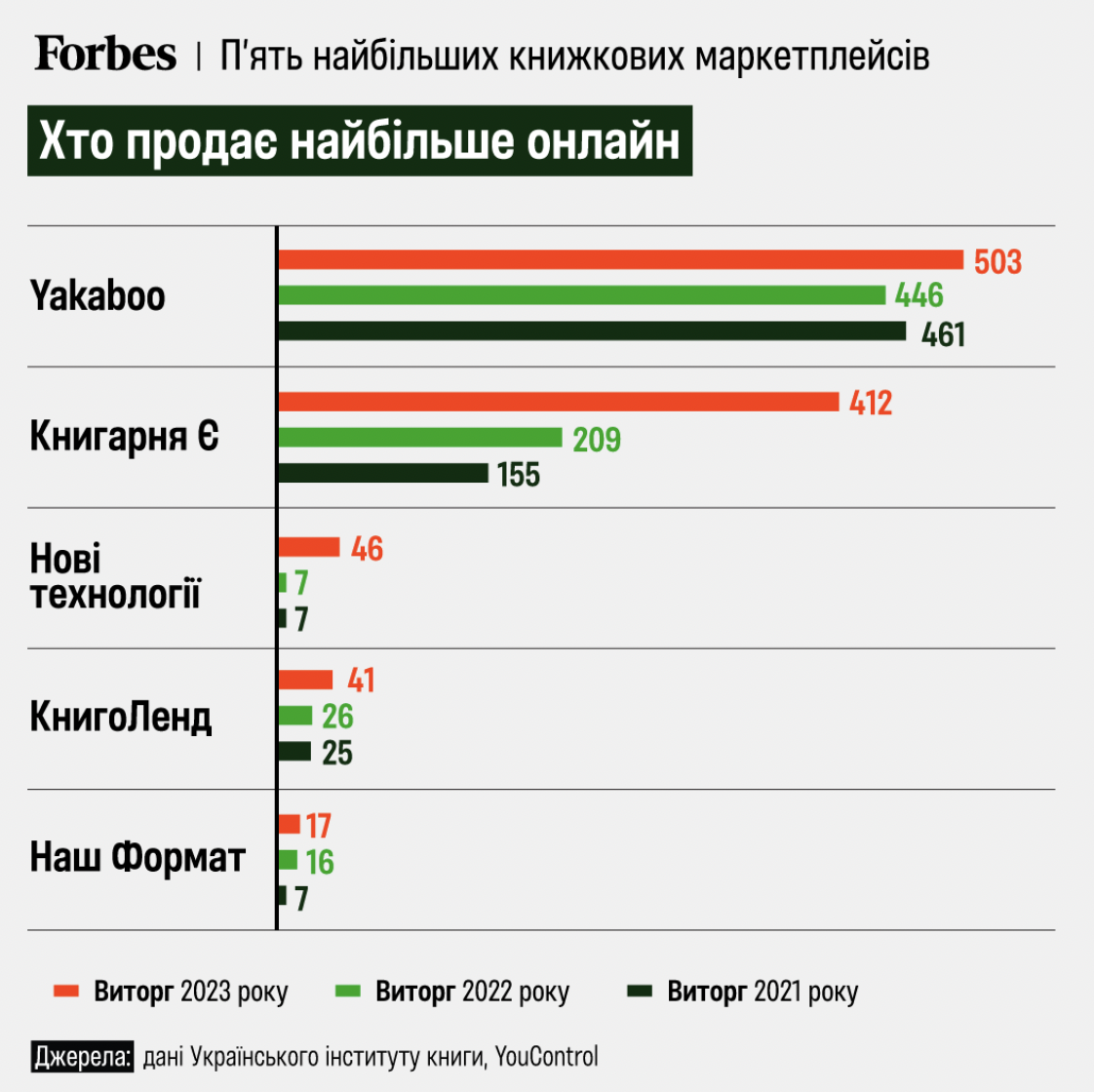 Megogo – серйозний конкурент багатьом гравцям ринку, вважає директор мережі книгарень Книголенд Ігор Зарудко. Найбільші онлайн-продавці книжок – Yakaboo і Книгарня Є. Виторг Yakaboo за 2023 рік – 503 млн грн, Книгарні Є – 412 млн грн. За два роки компанія збільшила виторг від онлайн-продажів у 2,6 раза, за даними Українського інституту книги.