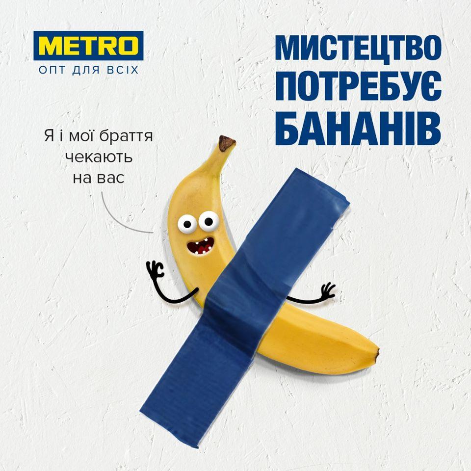 “В Нью-Йорку один художник з’їв банан іншого художника. Точніше, не банан — арт-об’єкт. Арт-об’єкт вартістю 150 тисяч доларів. Судитися збираються. Що за маячня? У нас в METRO цих арт-об’єктів цілі ящики. І завжди гарні, смачні, свіжі. Та й коштують дешевше. Хоч щодня новий банан до стіни приклеюй. Тож якщо мистецтво потребує бананів, приїздіть до нас. Жовтих на всіх вистачить!”,- написали цілий диспут в METRO Cash & Carry Ukraine. І запропонували інтерактивчик: “А ви б з яким продуктом зробили інсталяцію?”