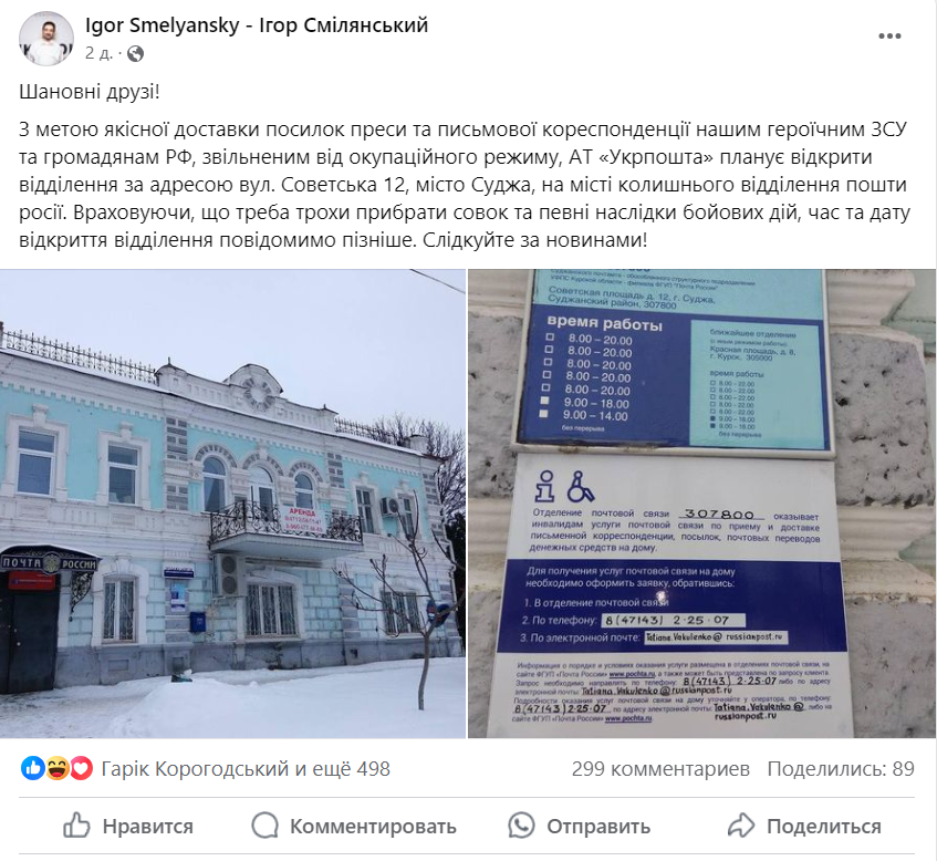 Генеральний директор Украпошта Ігор Смілянський 7 серпня з самого ранку написав, що Укрпошта планує відкрити відділення в місті Суджа. Про дату повідомлять згодом, бо ще чимало роботи, щоб прибрати «совок».
