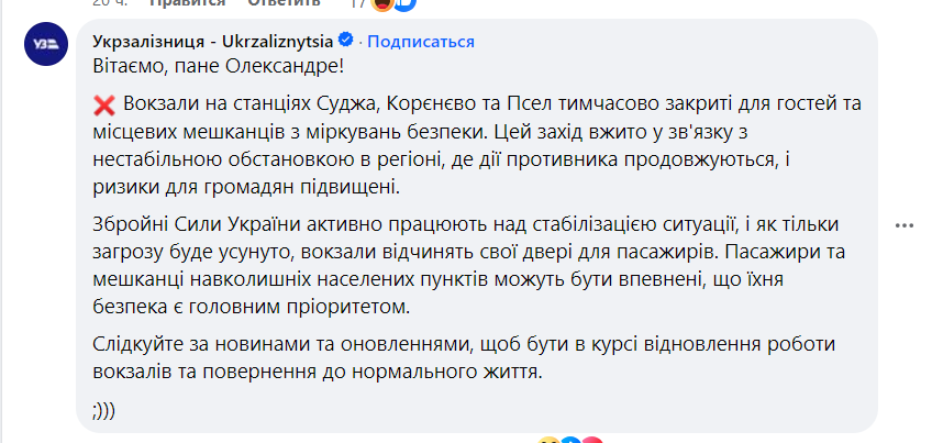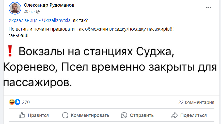 Військовий Олександр Рудоманов на свої сторінці в Facebook поскаржився на погану роботу Укрзалізниці, бо обмежили посадку та висадку пасажирів в місті Суджа. Проте отримав офіційний коментар від Укрзалізниці.