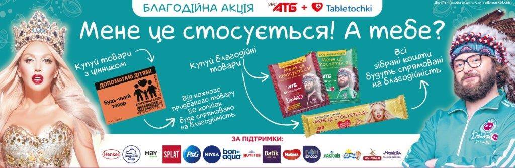 Покупцям на касах магазинів торговельної мережі «АТБ» пропонують придбати благодійні шоколад і чай, вартістю 7 і 5 гривень, та товари партнерів у залі, позначенні спеціальним цінником. Повна вартість від продажу благодійних товарів та 50 копійок від обраних товарів партнерів піде на лікування онкохворих дітей – підопічних фонду «Таблеточки».