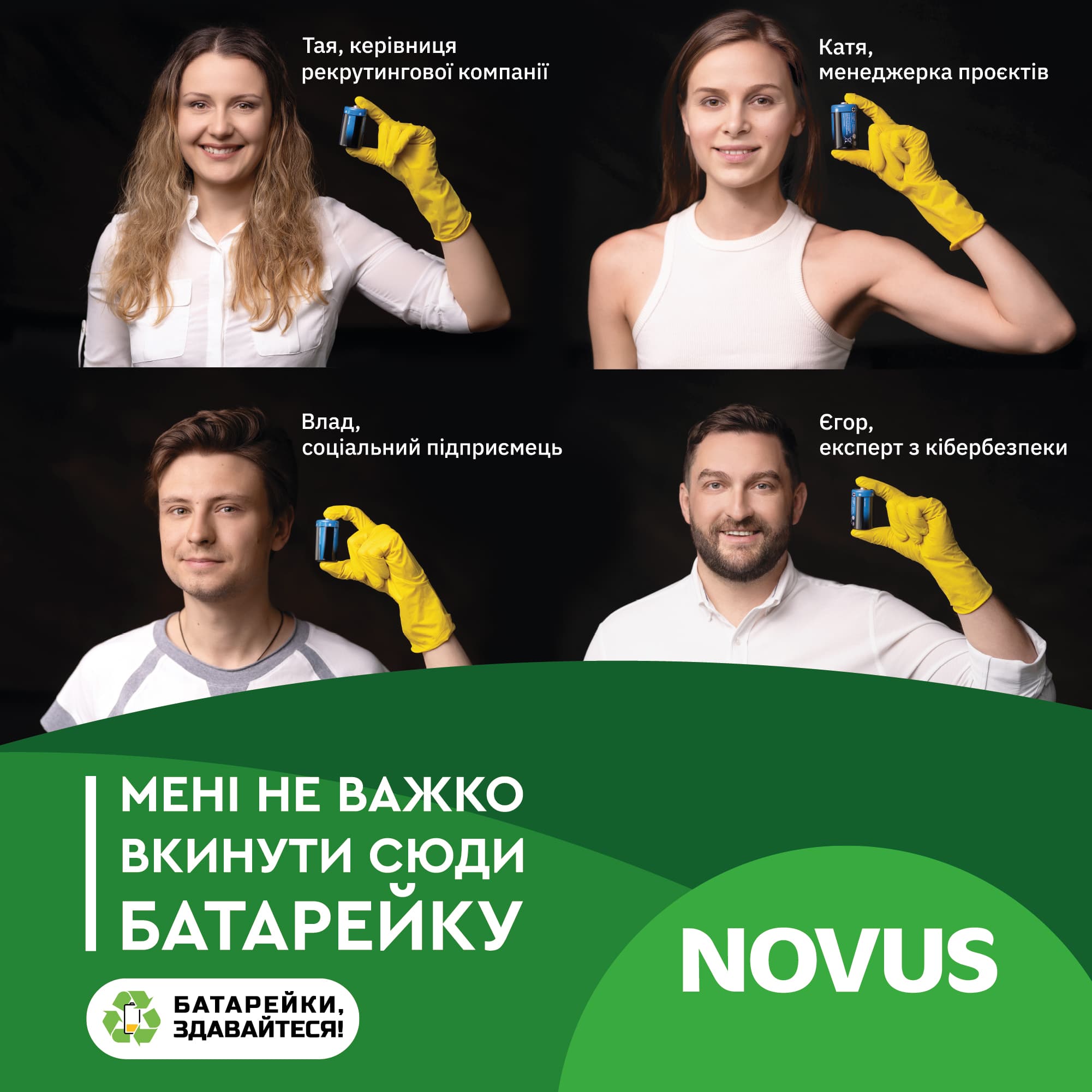 «Герої нашої комунікації, фотографії яких ми бачимо біля баків не є акторами. Їхні фото були розміщені на контейнерах для збору батарейок в Novus, аби привернути увагу людей до проблеми неправильної утилізації. Єгор, Таїсія, Влад і Катерина – цих чотирьох людей різних професій, хоббі та поглядів на життя об’єднує одне – вони соціально активні українці, і їм небайдуже яким повітрям дихатимуть вони та їхні близькі, яку питимуть воду, та чи в чистому ґрунті вирощуватимуться продукти харчування. Вони вже приєднались до соціально важливого проекту, пояснивши своє бачення – навіщо їм це потрібно.» – розповідають в мережі.