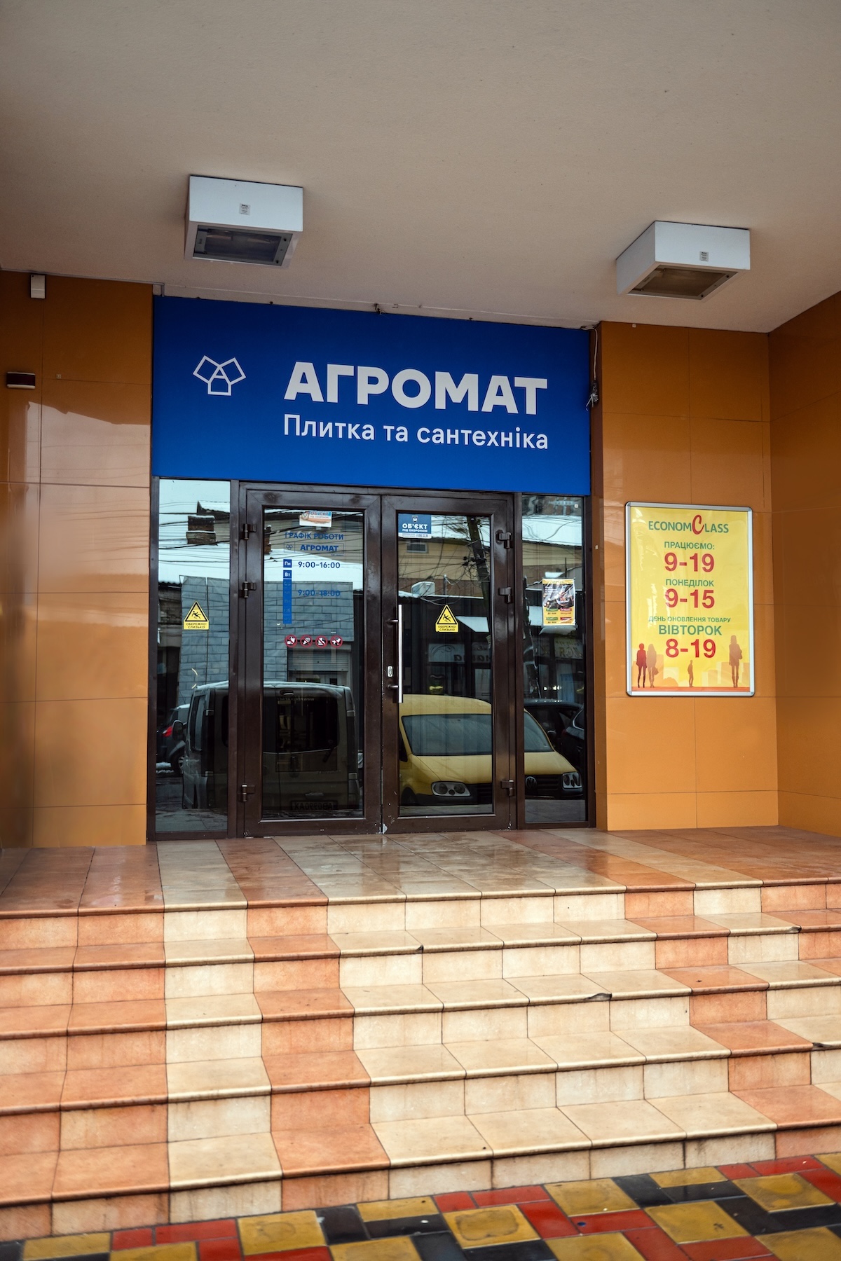 Довідка. Агромат — національна мережа магазинів плитки та сантехніки, заснована в 1993 році. Наразі мережа налічує 34 магазини у 22 містах України. Найбільший магазин, площею 16 000 кв. м, розташований у Києві, на вул. Академіка Булаховського, 4.
