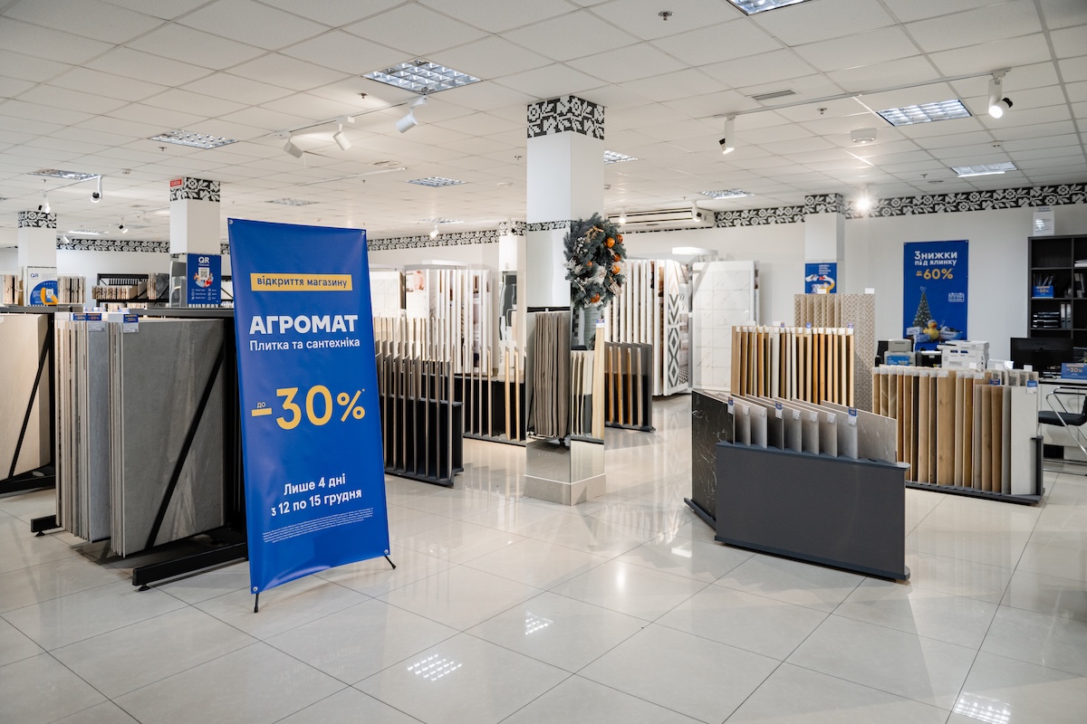 Новий Агромат у Стрию, площею понад 200 кв. м, пропонує широкий вибір плитки, сантехніки, підлогових покриттів та супутніх товарів для ремонту. Усе це в наявності тут і зараз, під будь-яку ідею та бюджет. З нагоди відкриття, лише з 12 до 14 грудня, в магазині діють знижки до 30% на плитку та сантехніку.