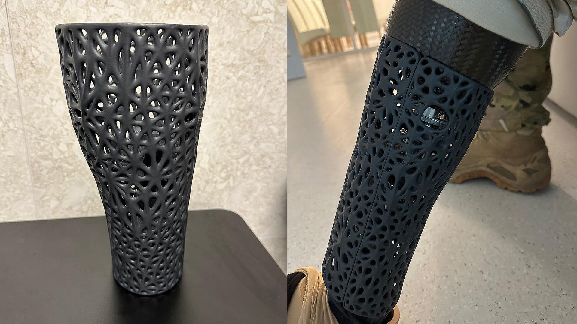 - Вибухотехнік Тарас отримав поранення у вересні 2022 року: через заборонену протипіхотну міну у Харківській області він втратив ліву ногу. Тарас отримав сучасний протез кінцівки, для якого в 3D-лабораторії змоделювали та надрукували косметичну накладку: вона прикриває елементи протезу та імітує форму гомілки. Після реабілітації Тарас має намір повернутися до виконання службових обов’язків та продовжити розмінування деокупованих територій України від російського залізяччя, мін та вибухових пристроїв. До речі, в 3D-лабораторії індивідуально виготовляють два типи накладок: сітчасті, більш косметичні, та суцільні, які захищають протез у польових умовах та сприяють його безпечному використанню.