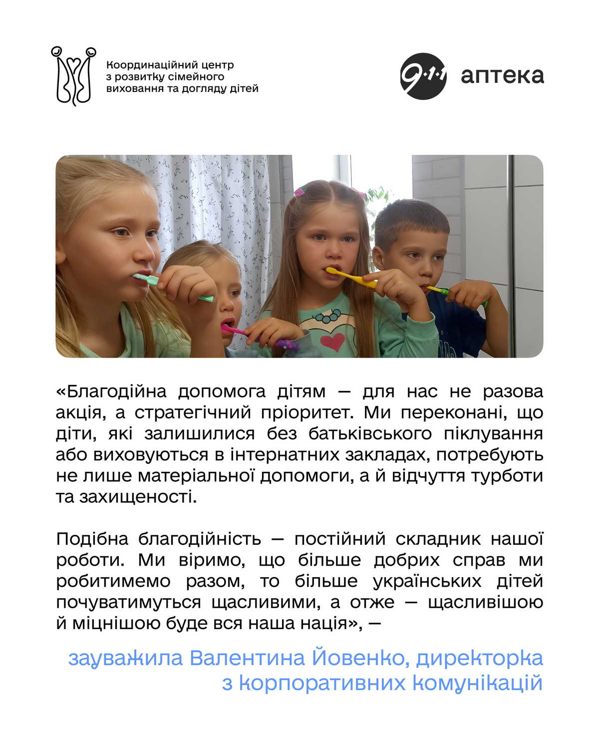 «Благодійна допомога дітям — для нас не разова акція, а стратегічний пріоритет. Ми переконані, що діти, які залишилися без батьківського піклування або виховуються в інтернатних закладах, потребують не лише матеріальної допомоги, а й відчуття турботи та захищеності. Подібна благодійність — постійний складник нашої роботи. Ми віримо, що більше добрих справ ми робитимемо разом, то більше українських дітей почуватимуться щасливими, а отже — щасливішою й міцнішою буде вся наша нація», — резюмує директорка з комунікацій компанії Аптека 9-1-1 Валентина Йовенко.