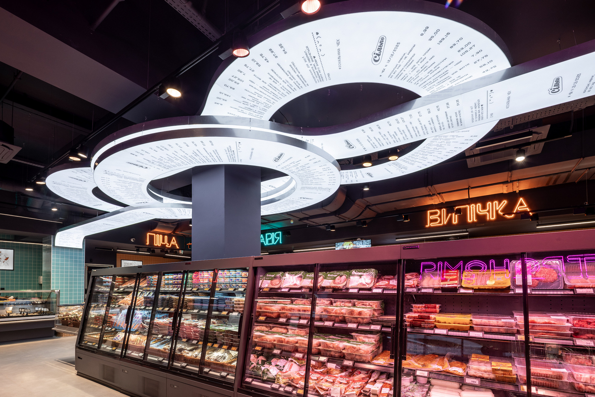 Вивіски відділів також стилізовані під лабіринти, а в центрі супермаркету розмістили головний артоб’єкт — чек Сільпо.