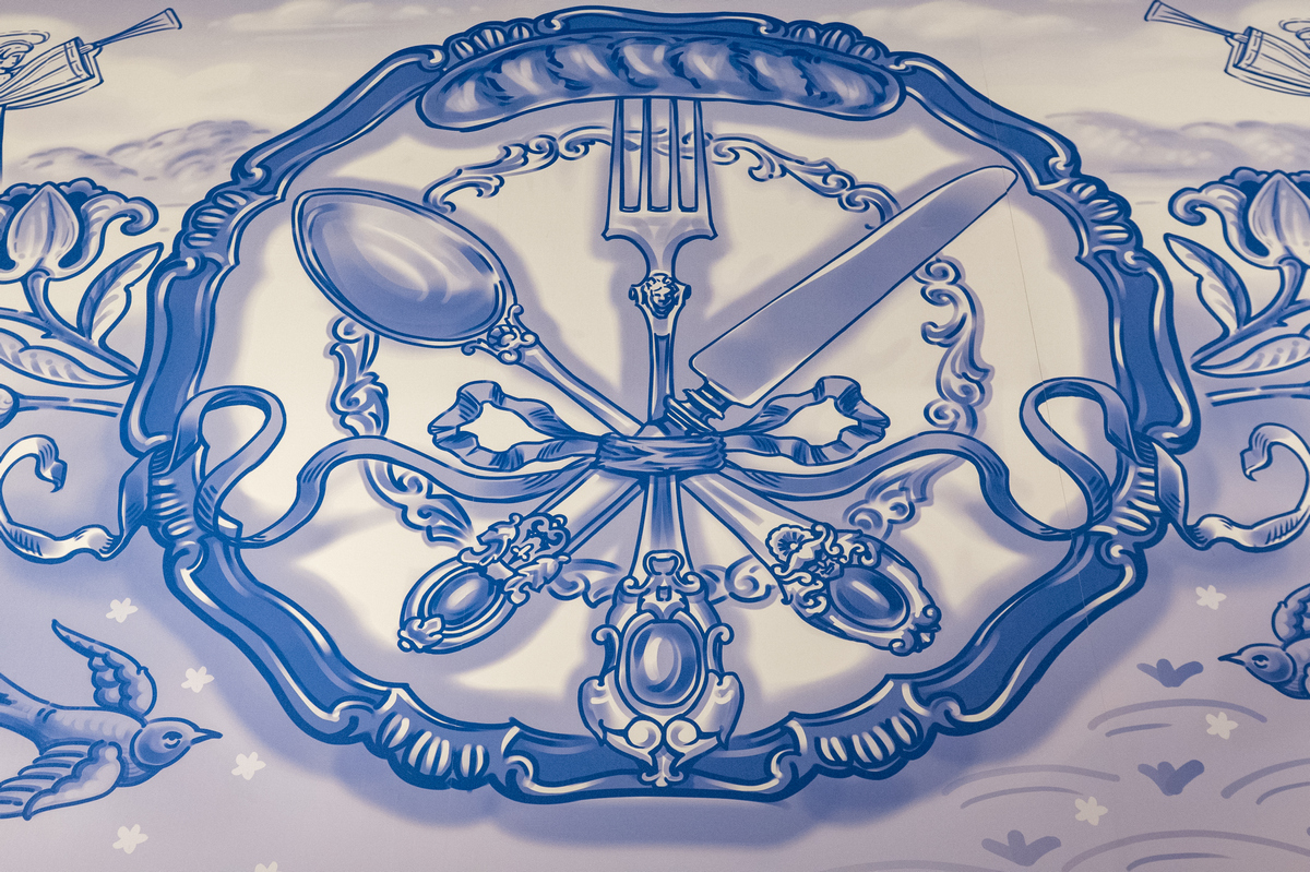 Інтер’єр магазину нагадує атмосферу морського узбережжя: світлі тони, дерев’яна підлога, синя стеля та декоративні панно. На вході — відділ «Власної кондитерської» та кав’ярня, оформлені в морському стилі. Тут стіни розписані вручну, а на колонах можна побачити справжні плитки, які привезли з Португалії. Окрема мозаїка присвячена історії міста Ірпінь.