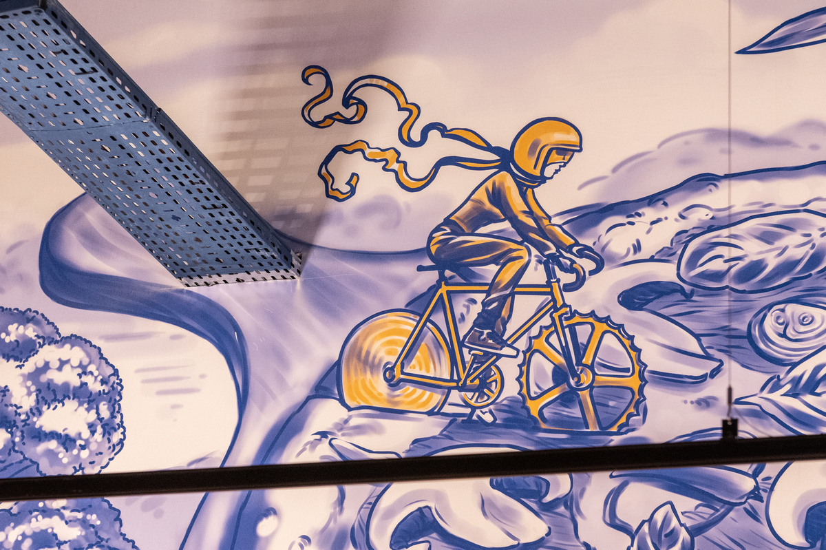 На вході гостей зустрічають веселі персонажі, які підказують напрямки, а на стелі магазину — кольорові лінії, кожна з яких веде до певного відділу. Тож навігація магазином перетворюється на маршрут з підказками, який приємно проходити разом із візочком.
