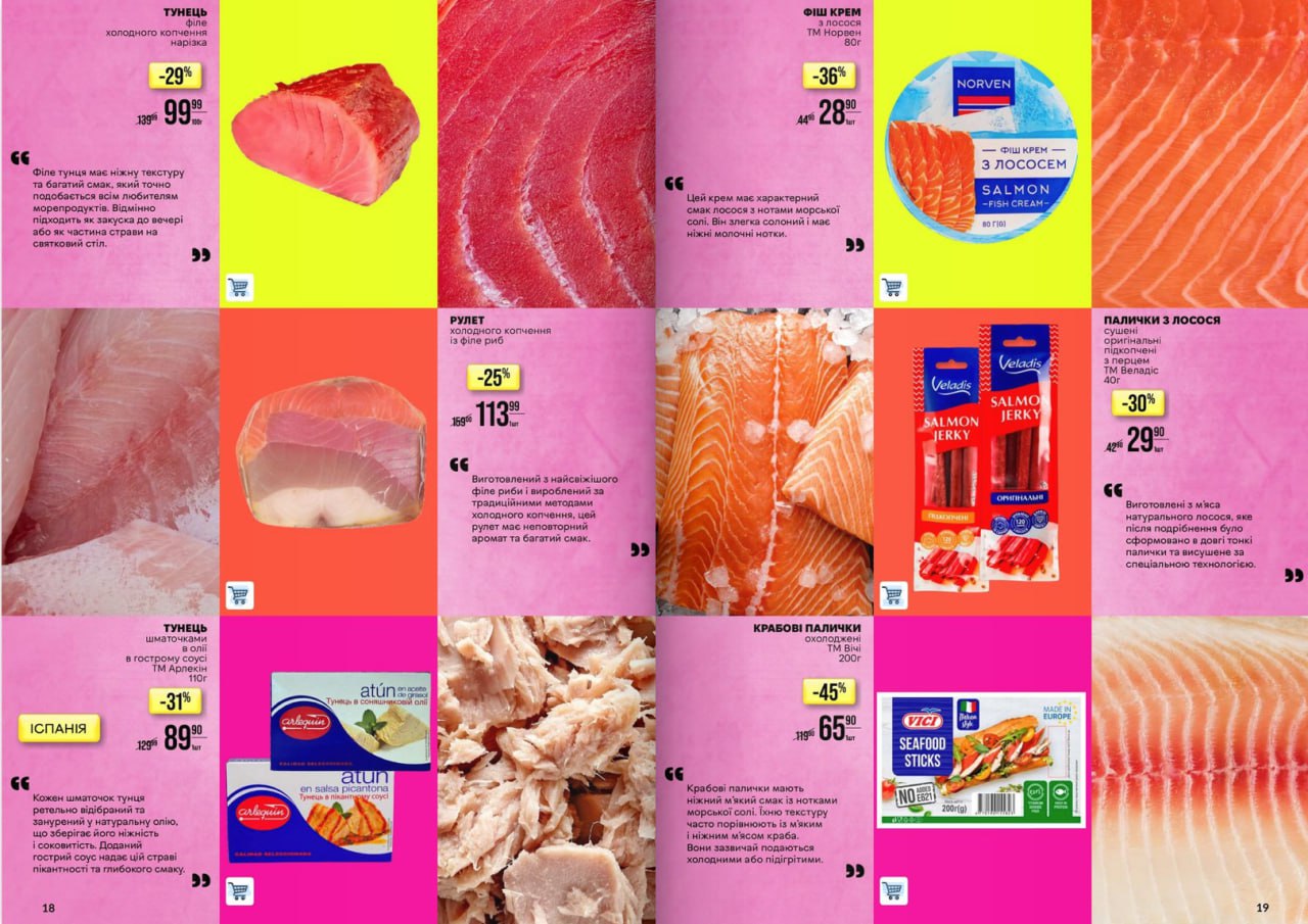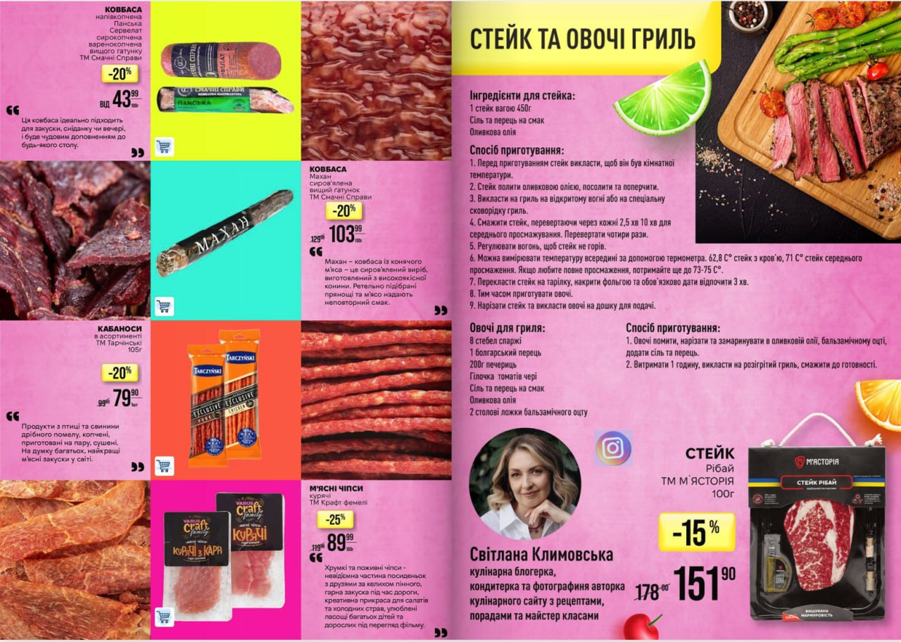 У каталозі “Літній карнавал” клієнти знайдуть різноманітні види м’яса — біфштекс, стейк, томлену шию та інші, для найсмачнішого барбекю. Для тих, хто більше полюбляє рибу та морепродукти, також знайдеться чимало цікавого.