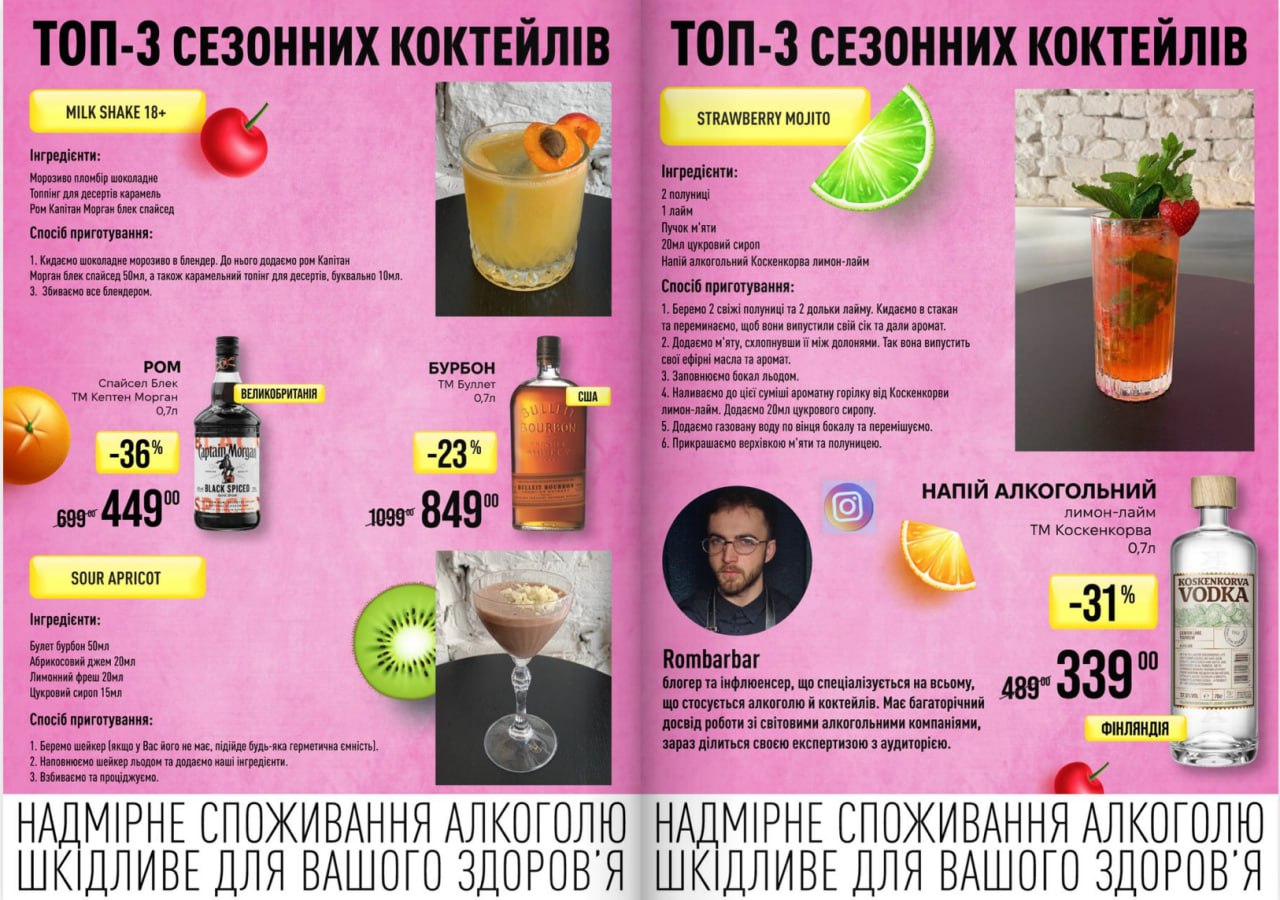 Спеціально для літнього каталогу блогер Rombarbar, який спеціалізується на алкогольних напоях, підготував рецепти трьох сезонних коктейлів. Milk shake 18+ — це переосмислення традиційного літнього рецепта на основі морозива. Sour apricot додасть приємної кислинки до спекотного дня, а Strawberry mojito подарує свіжість та чудовий післясмак.