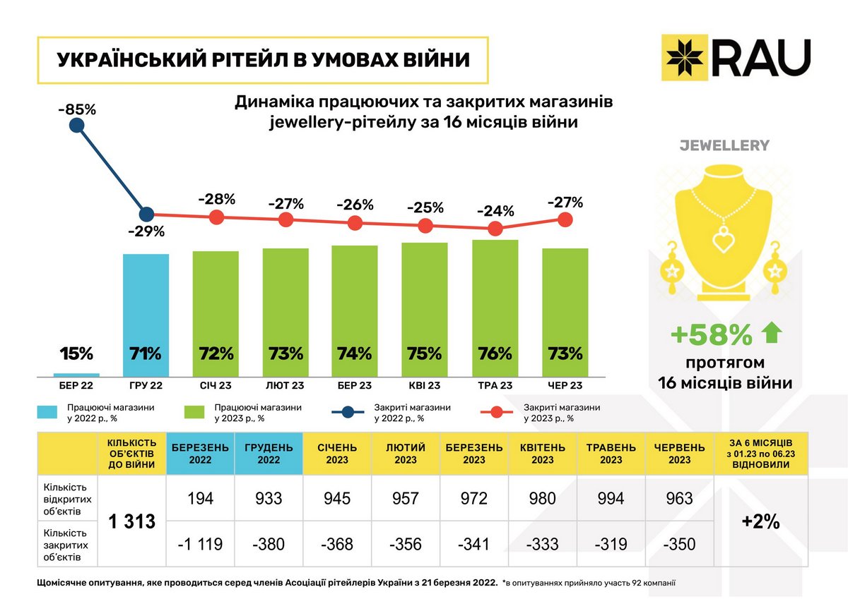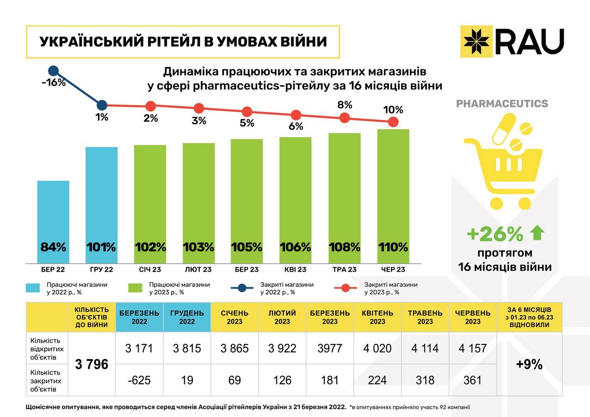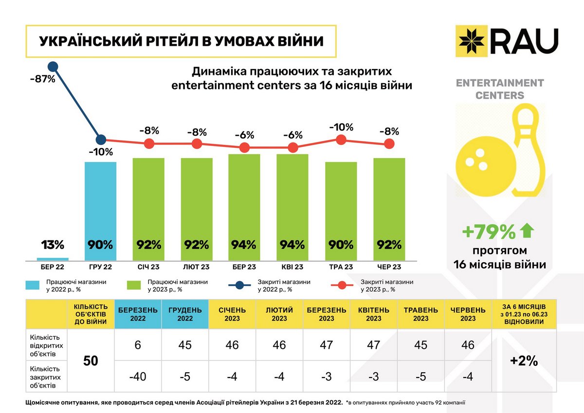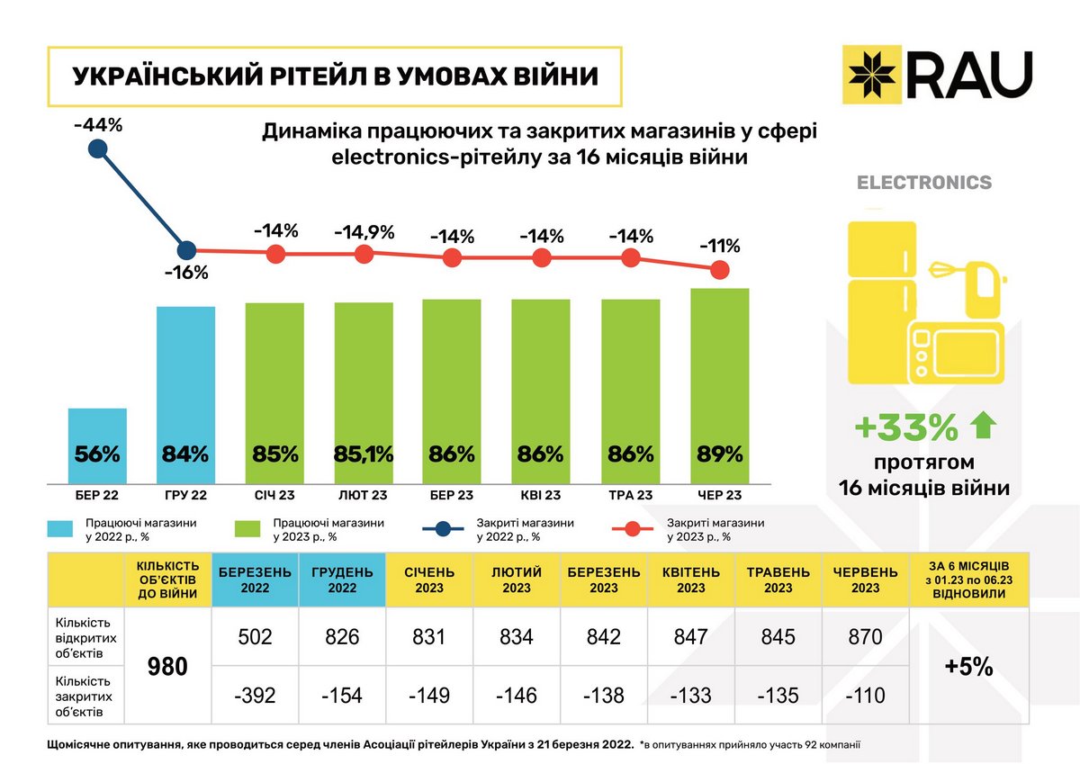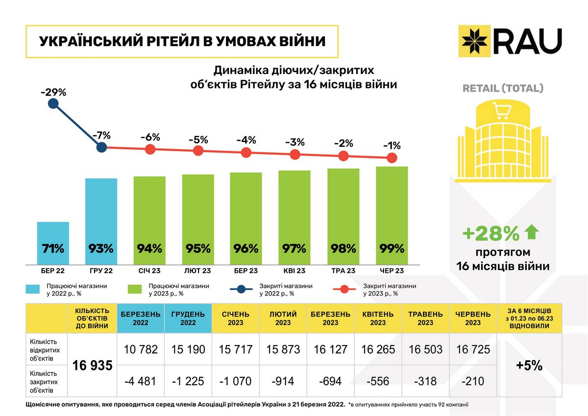 Як показало щомісячне дослідження, яке регулярно проводиться серед членів Асоціації рітейлерів України з 21 березня 2022 року методом онлайн-опитування майже сотні власників та CEO підприємств по всій Україні, наразі закритими лишається тільки 1% торгових об’єктів/магазинів. За 16 місяців війни цей показник зменшився на 28%.