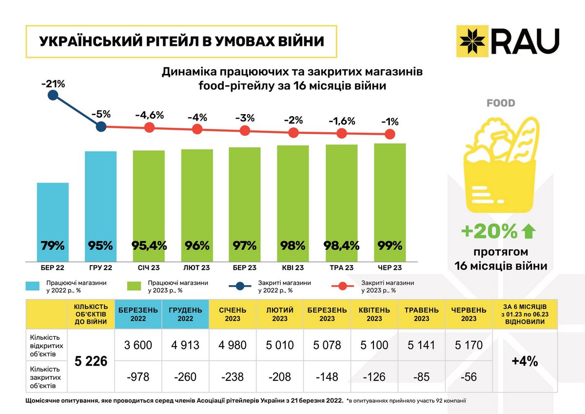 Станом на кінець 2022 року вже працювало 95% від довоєнної кількості магазинів або 4913 торгових точок. За шість місяців поточного року продовольчі мережі змогли запустити в роботу додатково ще 4% магазинів, досягнувши позначки у 5170 працюючих маркетів. Відповідно, кількість закритих торговельних точок зменшилася до 56. Тобто не більше 1% від довоєнної кількості.