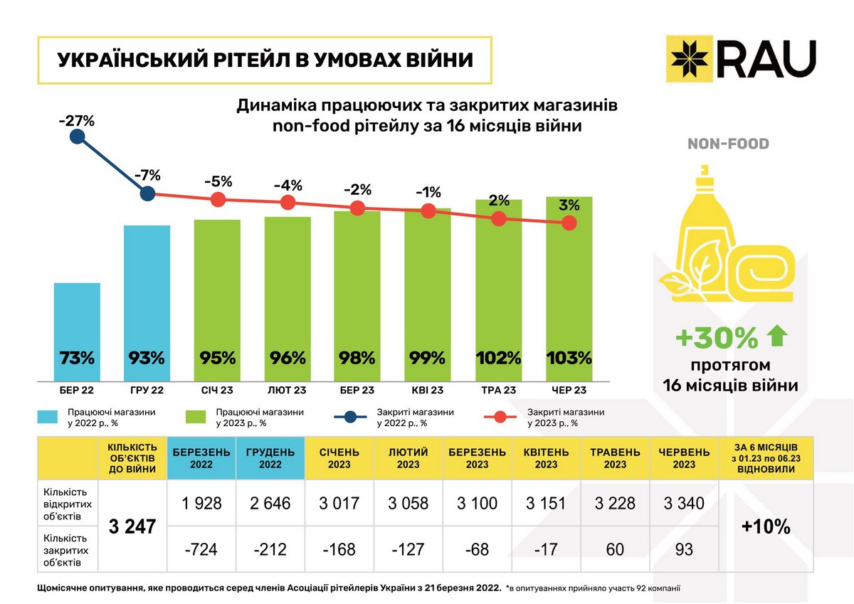 Загалом із початку війни непродовольчий рітейл покращив показник працюючих торгових точок на 30% (порівняно із березнем 2022-го, коли працювало тільки 73% магазинів мереж), а з початку 2023 року – на 10%.