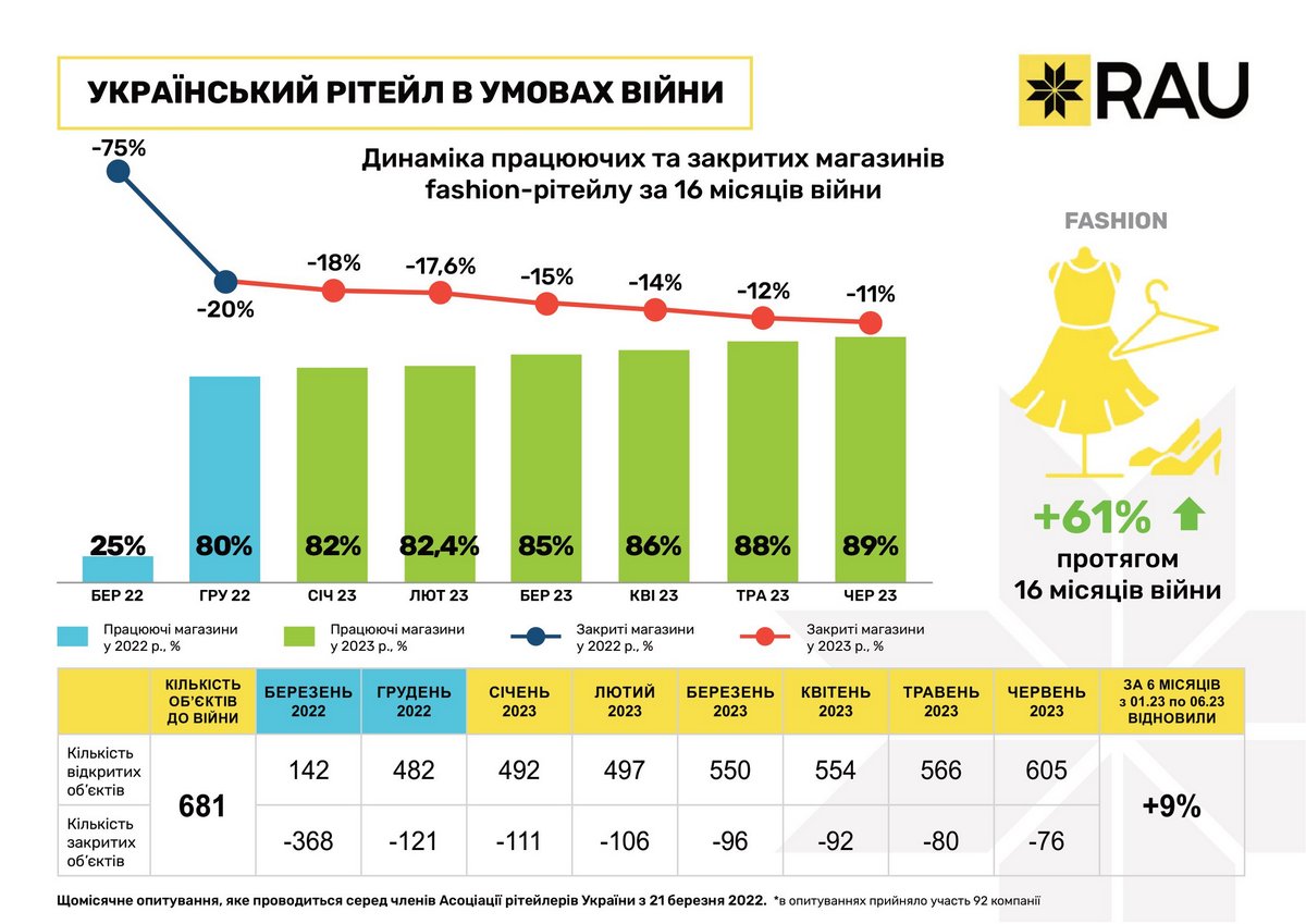 Так сталося, що торгівля одягом, взуттям і супутніми аксесуарами сильно постраждала від порушення логістики та втрати чи закриття виробництв в Україні. На додачу люди попервах купували лише продукти та найнеобхідніші речі. Але сектор fashion-рітейлу не тільки знайшов вихід зі скрутної ситуації, але й зміг відновити роботу 61% магазинів протягом 16 місяців війни. Так, якщо на початку весни 2022 року працювали всього 25% магазинів, то вже в грудні їх було 80%. Тобто відновилося більше половини закритих спочатку торгових точок.
