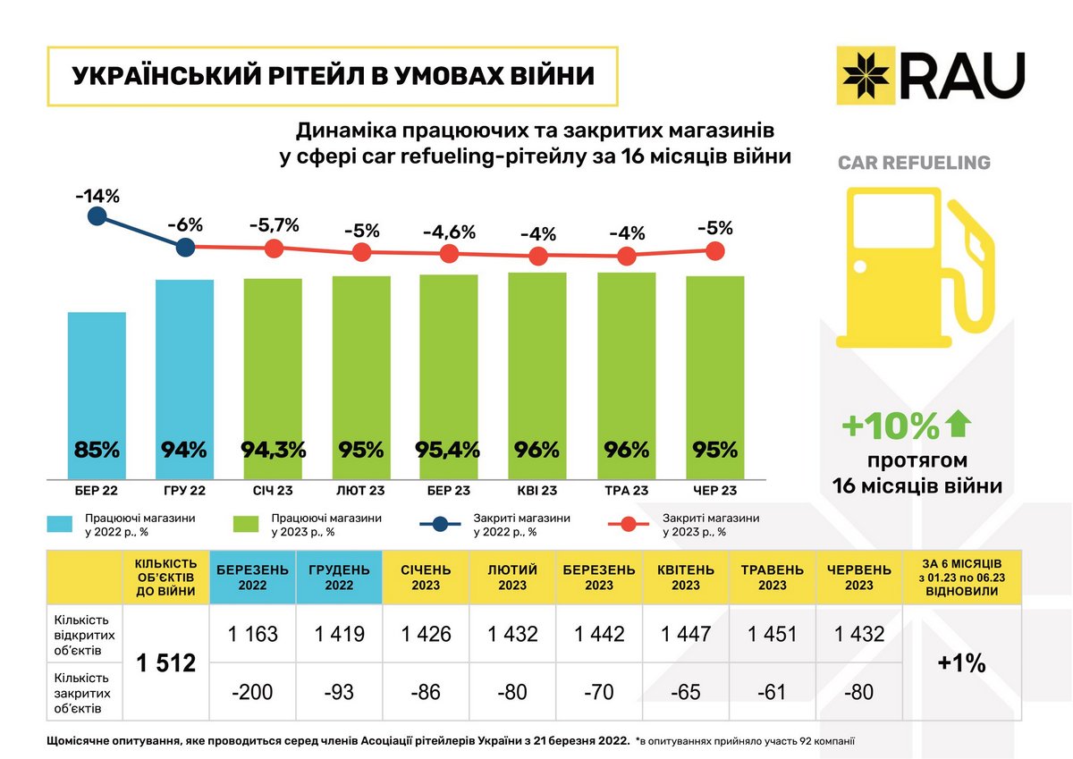 Торгівля паливом затребувана завжди й тому здебільшого закриття 200 заправок (або 14%) із 1512, які працювали до війни, було пов’язано перш за все руйнуваннями або окупацією ворогом. Відновлення функціонування вцілілих АЗК та відбудова зруйнованих поступово збільшували частку працюючих заправок. Вже до кінця минулого року відновилося 94% із 1512 АЗК, які були до війни. Але на відміну від, скажімо, аптечного рітейлу, паливні мережі майже не розвиваються далі.