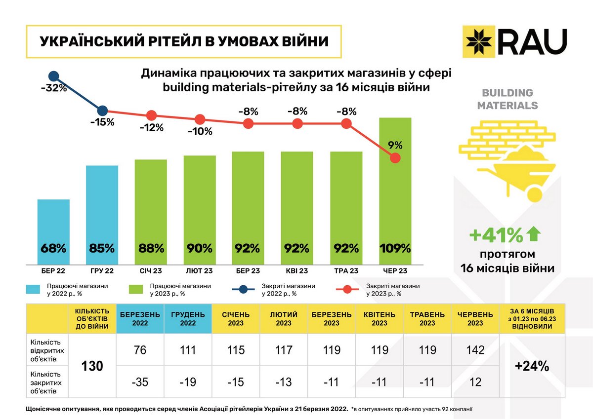 Але порівняно із березнем минулого року, коли із 980 магазинів працювало трохи більше половини (56%), помітно значний прогрес. Так, за 16 місяців війни вдалося повернути до роботи 33% магазинів. Відповідно кількість закритих магазинів впала до 110.