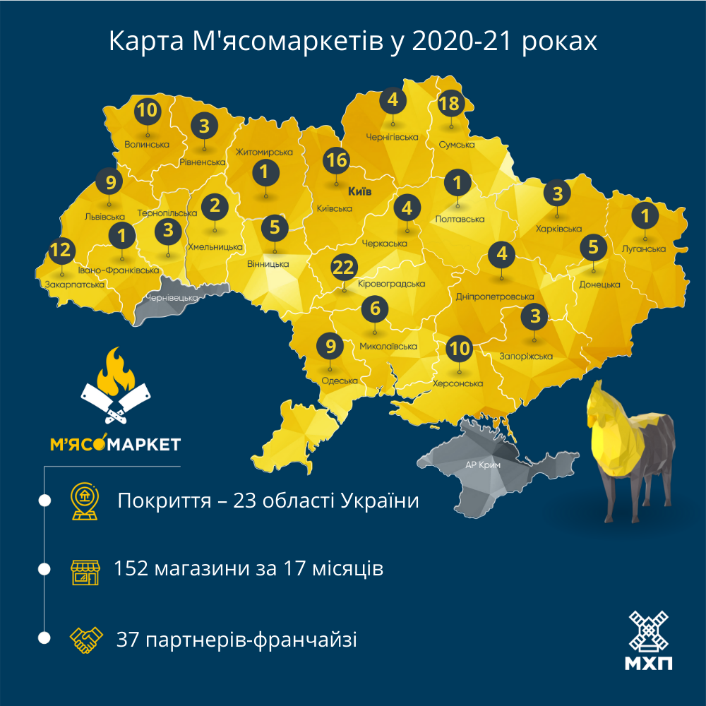 Як повідомили RAU у прес-службі компанії, за 11 місяців 2021 року МХП відкрив 104 М’ясомаркет, восени торгова мережа поповнилася 44-мя новими торговими точками. В МХП відзначають, що не роблять акцент виключно на великих містах. В обласних центрах сконцентровані лише 50% магазинів, решта розташовані в містечках, селищах та селах, що робить мережу доступною для людей по всій країні.